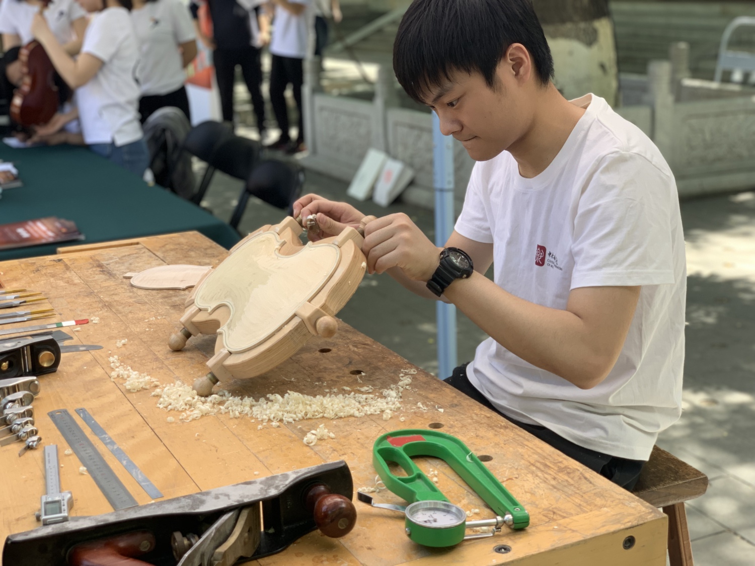 设置于广场的“提琴制作实操展示区”,也同样受到了来访者们的关注,大家均为献艺者神奇的制作技艺深深吸引,驻足观看。感兴趣的来访者还亲自动手体验提琴制作操作的过程,蔚为叹服。