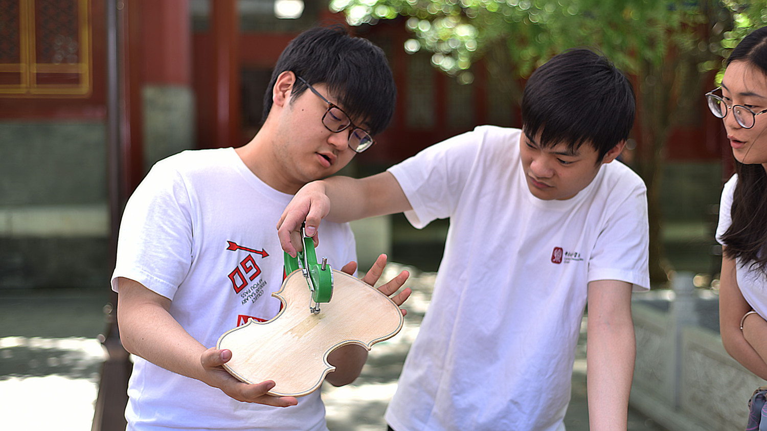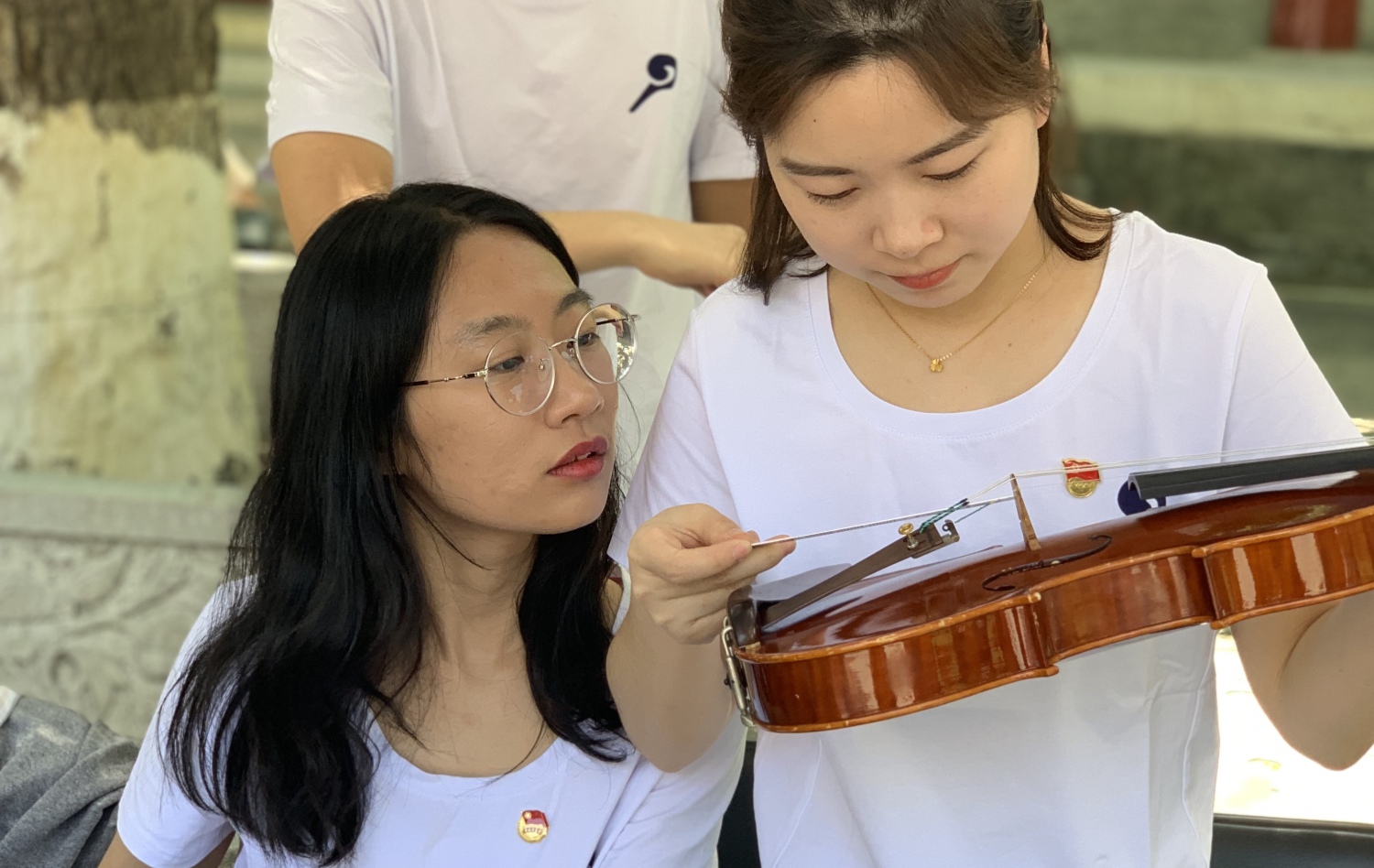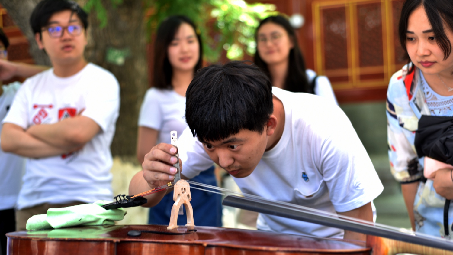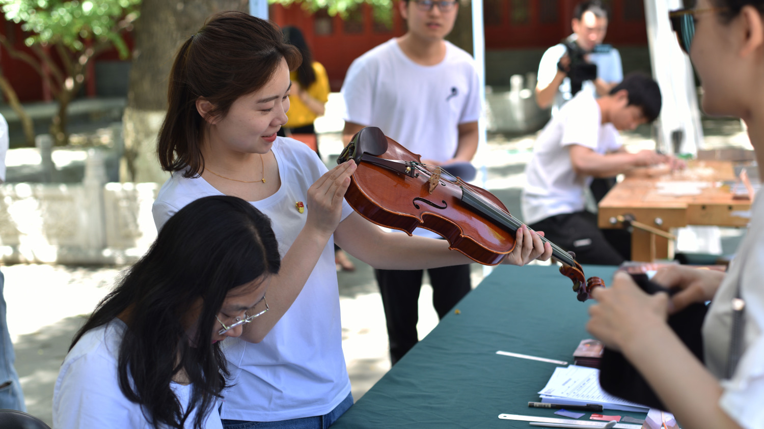 中午时分,学校室外大屏幕滚动播出本次活动的宣传片,展示了提琴制作研究中心(以下简称“中心”)师生们的日常教学与工作。宣传片细腻生动感人,其中的提琴演奏者是来自中心二年级的同学马小淅,演奏用琴来自中心青年学生手工制作,音乐由开云官网作曲系电子音乐录音艺术的研究生帮助录制完成。悠扬的琴声响彻校园,为活动增添了亲切之感。位于学校王府院广场,来自中心的党团青年师生为弦乐演奏专业的同学义务诊断提琴健康状况、解答提琴出现的问题,受到了各界的赞誉。前来诊断的同学络绎不绝。