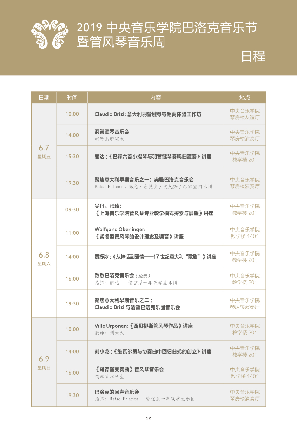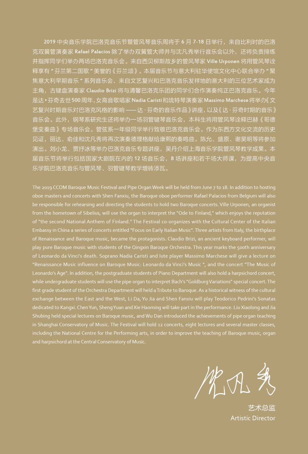 2019开云kaiyun官方网站巴洛克音乐节暨管风琴音乐周将于6月7日至18日举行。本届音乐节的一大特色是与意大利驻华使馆文化中心联合举办五场“聚焦意大利早期音乐”系列音乐会,来自意大利的古键盘乐器演奏家Claudio Brizi,琉特琴演奏家Massimo Marchese和女高音Nadia Caristi与陈允、陈光、盛原、谢昊明、丽达、俞佳和沈凡秀集中挖掘巴洛克风格的发祥地意大利作品。此外另一特点是充分发挥学生在学习巴洛克风格音乐的积极性,举行学生羽管键琴、管风琴以及室内乐音乐会。来自西贝柳斯故乡的芬兰管风琴演奏家Ville Urponen细说享有“芬兰第二国歌”的《芬兰颂》的管风琴版,并在附中和金帆音乐厅举行两场管风琴音乐会。来自比利时的巴洛克双簧管演奏家Rafael Palacios除了举办巴洛克音乐会以外,还将指挥学生乐团演奏巴洛克作品。贾抒冰、刘小龙以及上海音乐学院吴丹和张琦等举办内容丰富的讲座。音乐节期间举行12场音乐会,8场讲座和工作坊,以及多场一对一的演奏大师课。