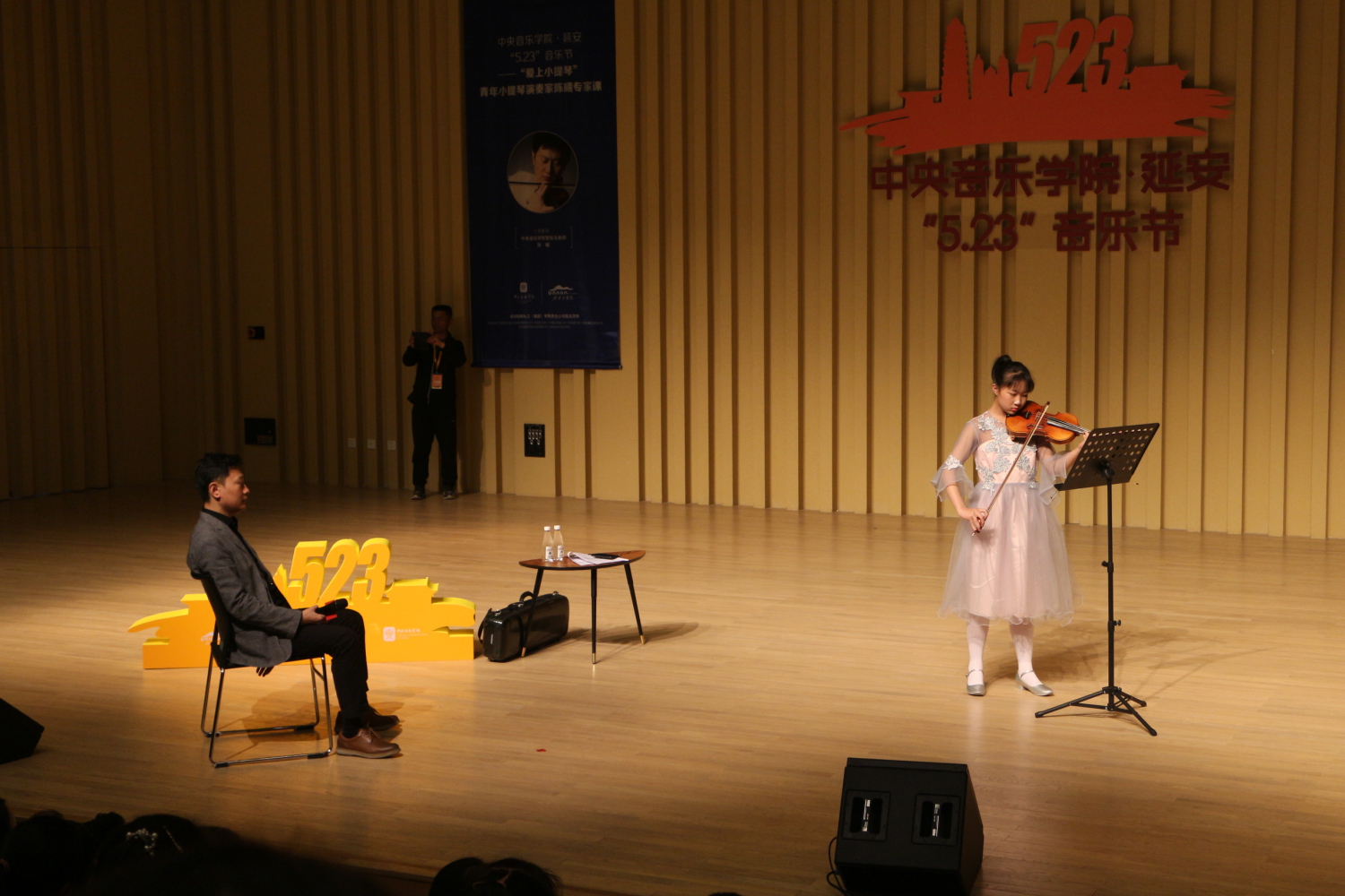 接下来的环节,延安当地的三位小提琴学生杜晓彤、贺子涵、杨晰然分别为现场带来了莫扎特《小步舞曲》、茅沅《新春乐》、科马洛夫斯基《e小调第一小提琴协奏曲》三首作品片段。