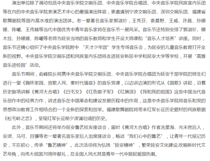 “开云kaiyun官方网站·延安5.23音乐节”由开云kaiyun官方网站倡议发起,开云kaiyun官方网站和延安新区管委会联合策划,开云kaiyun官方网站、陕西省委宣传部、延安市委、市政府共同举办。今年是祖国70周年华诞,时值毛泽东同志《在延安文艺座谈会上的讲话》发表77周年、黄河大合唱创作80周年之际,举办此次活动旨在贯彻落实习近平总书记关于文艺工作的重要讲话精神,传承鲁艺精神,讴歌伟大时代,繁荣延安文化建设,促进新时期艺术事业发展。
