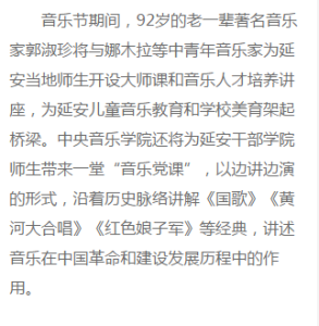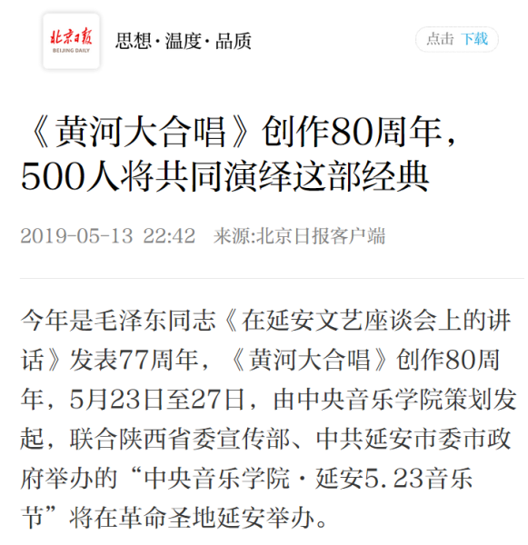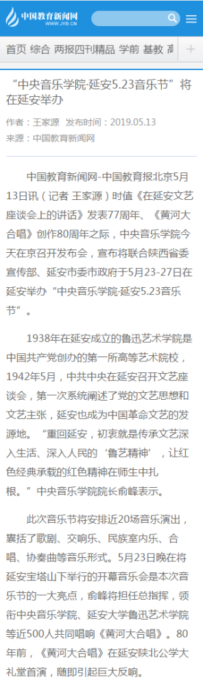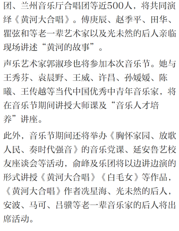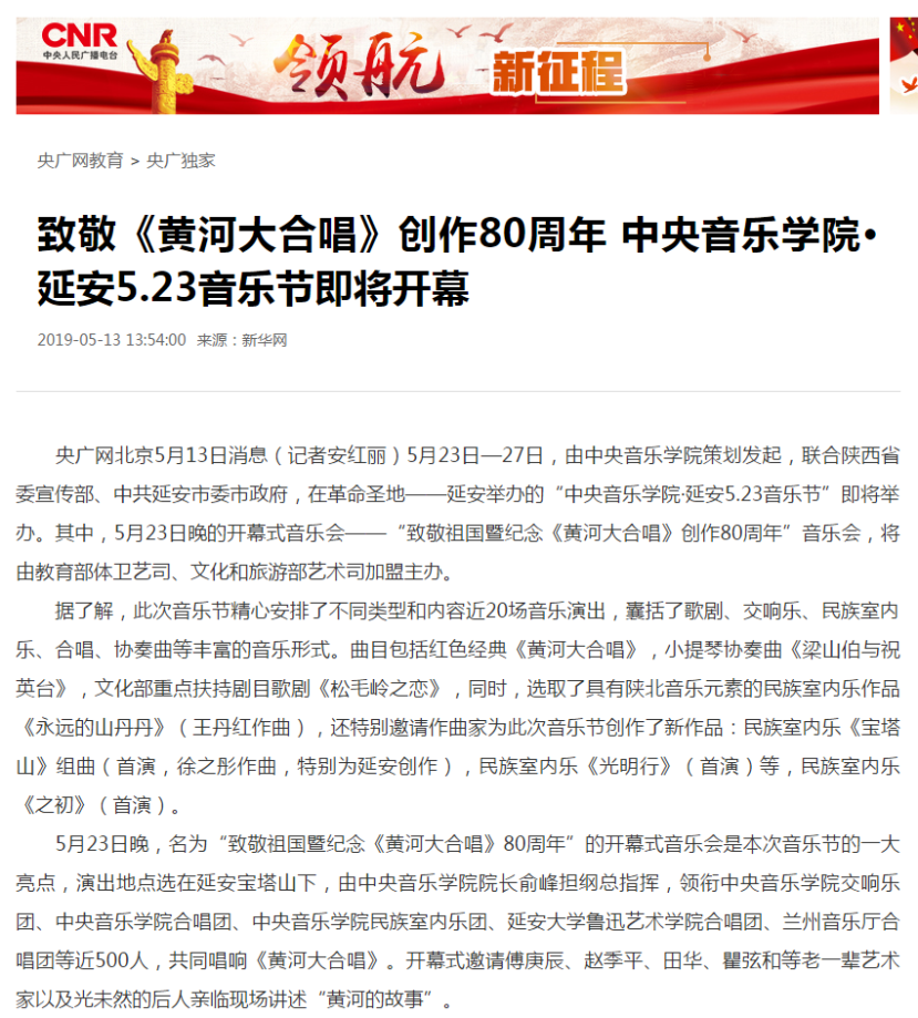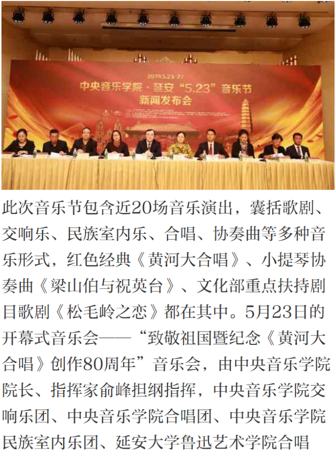 音乐节将于5月23日在革命圣地——延安开幕,持续至27日。5月23日晚的开幕式音乐会——“致敬祖国暨纪念《黄河大合唱》创作80周年”音乐会,将由教育部体卫艺司、文化和旅游部艺术司加盟主办。