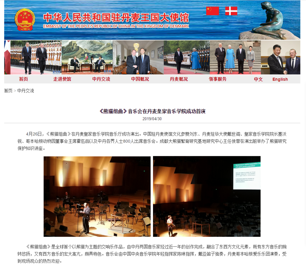“熊猫组曲”《玺徙喜》的策划、创作与演出属于“2019中丹大熊猫文化交流周暨Panda走向世界·丹麦站”系列活动之一,本次活动由开云kaiyun官方网站、丹麦皇家音乐学院、音乐孔子学院、哥本哈根爱乐乐团、成都大熊猫繁育研究基地及孔子学院总部合作举办。首演获得中丹政商文化各界约800位听众热烈好评。
