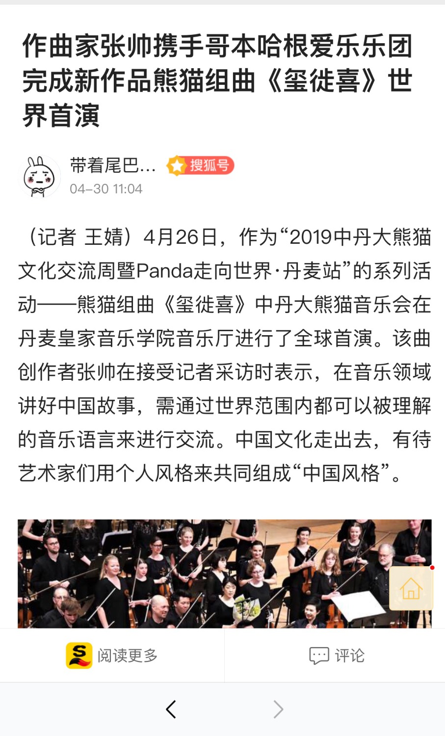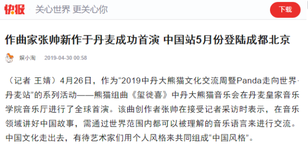 多家媒体对首演进行了报道。其中,新华社客户端刊登的“用音乐讲好中国故事——熊猫组曲《玺徙喜》在丹麦全球首演”署名文章获得近50万浏览量。小编特此转载,以飨读者。