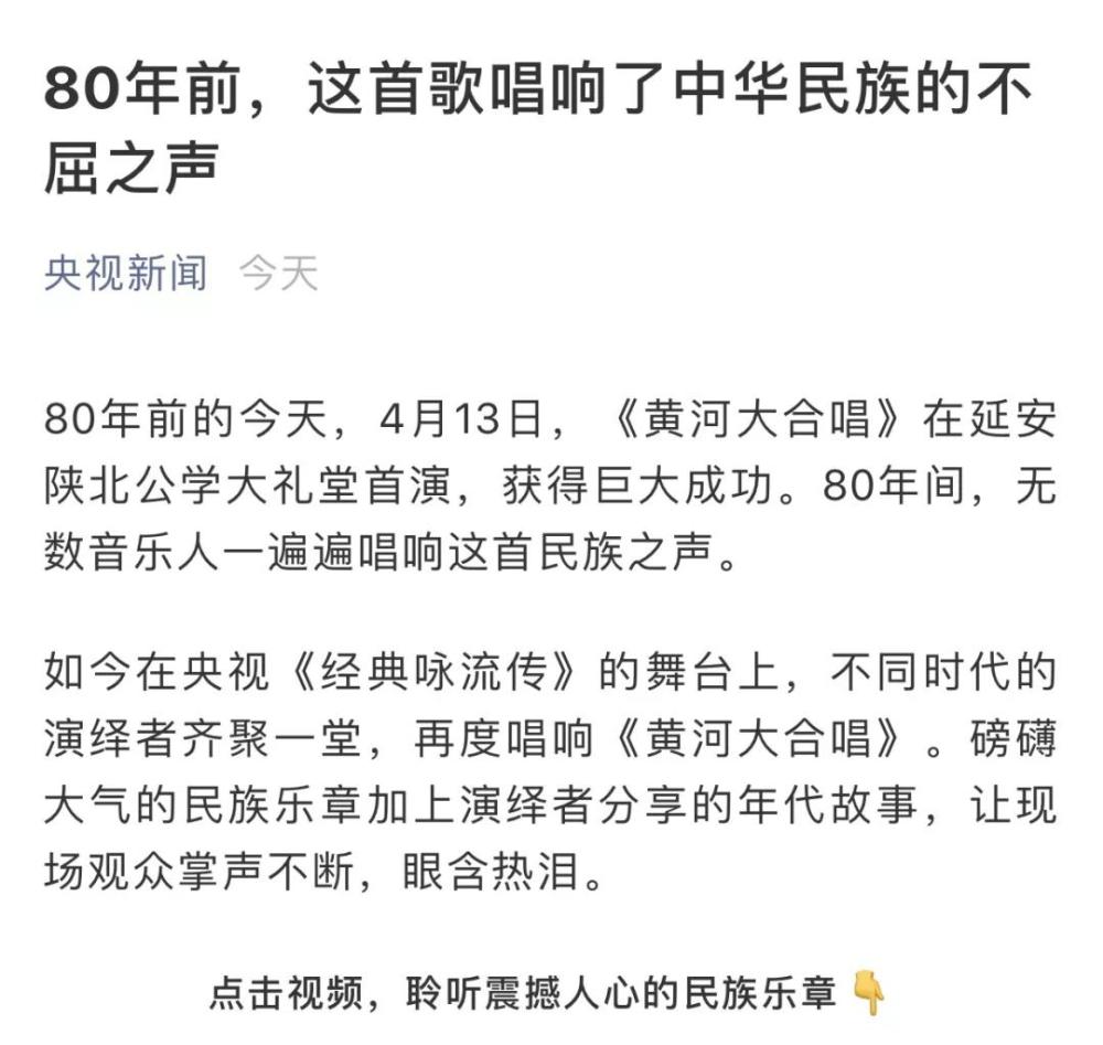 今晚(4月13日)20:00中央电视台一频道《经典咏流传》播出纪念《黄河大合唱》诞生80周年特别节目。开云kaiyun官方网站与延安大学鲁迅艺术学院再次联手出演,由俞峰院长执棒开云kaiyun官方网站交响乐团、开云kaiyun官方网站合唱团、延安大学鲁迅艺术学院合唱团联袂不同时代的演绎者齐聚一堂,再现气势磅礴的《黄河大合唱》,致敬经典、祝福祖国!敬请朋友们准时观看!
