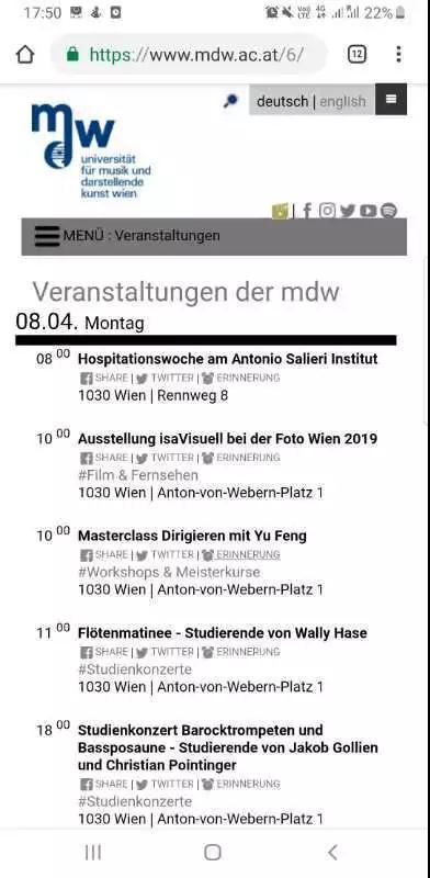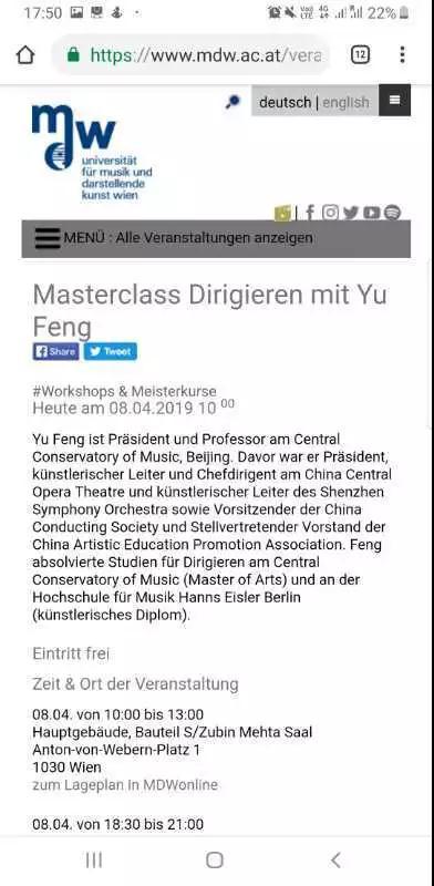 开云kaiyun官方网站院长俞峰教授在维也纳音乐与表演艺术大学举行大师课,校方官网上的大师课信息