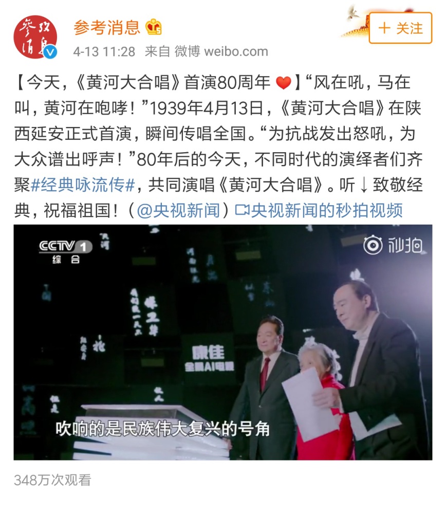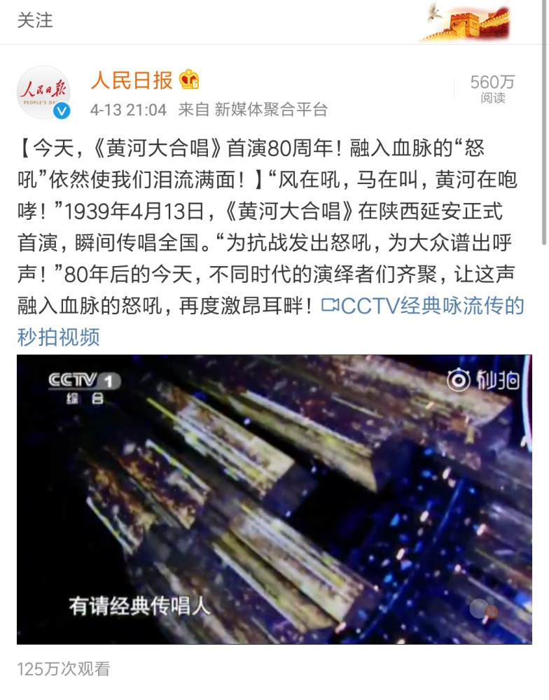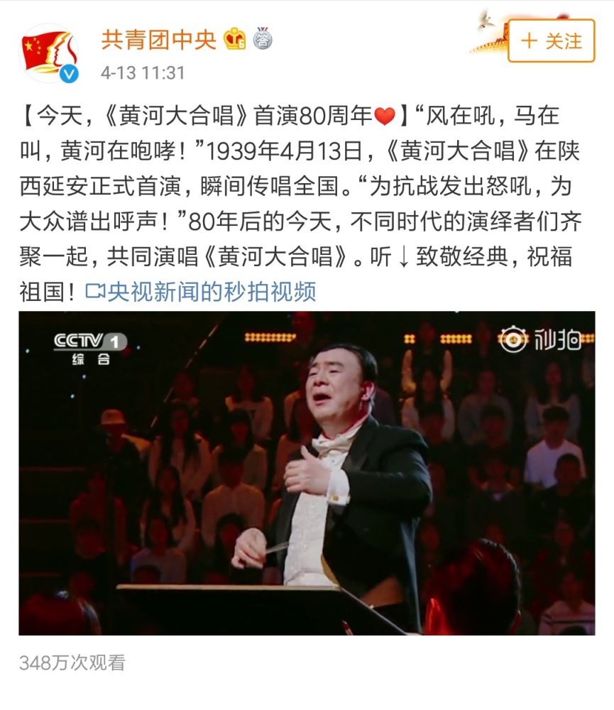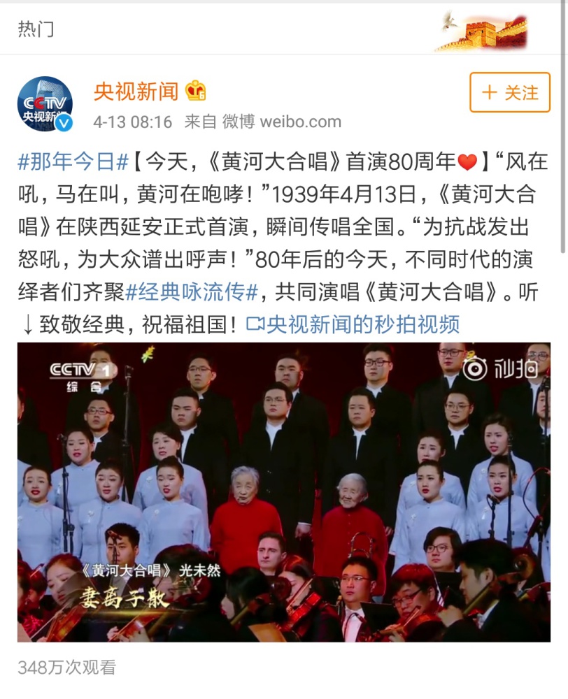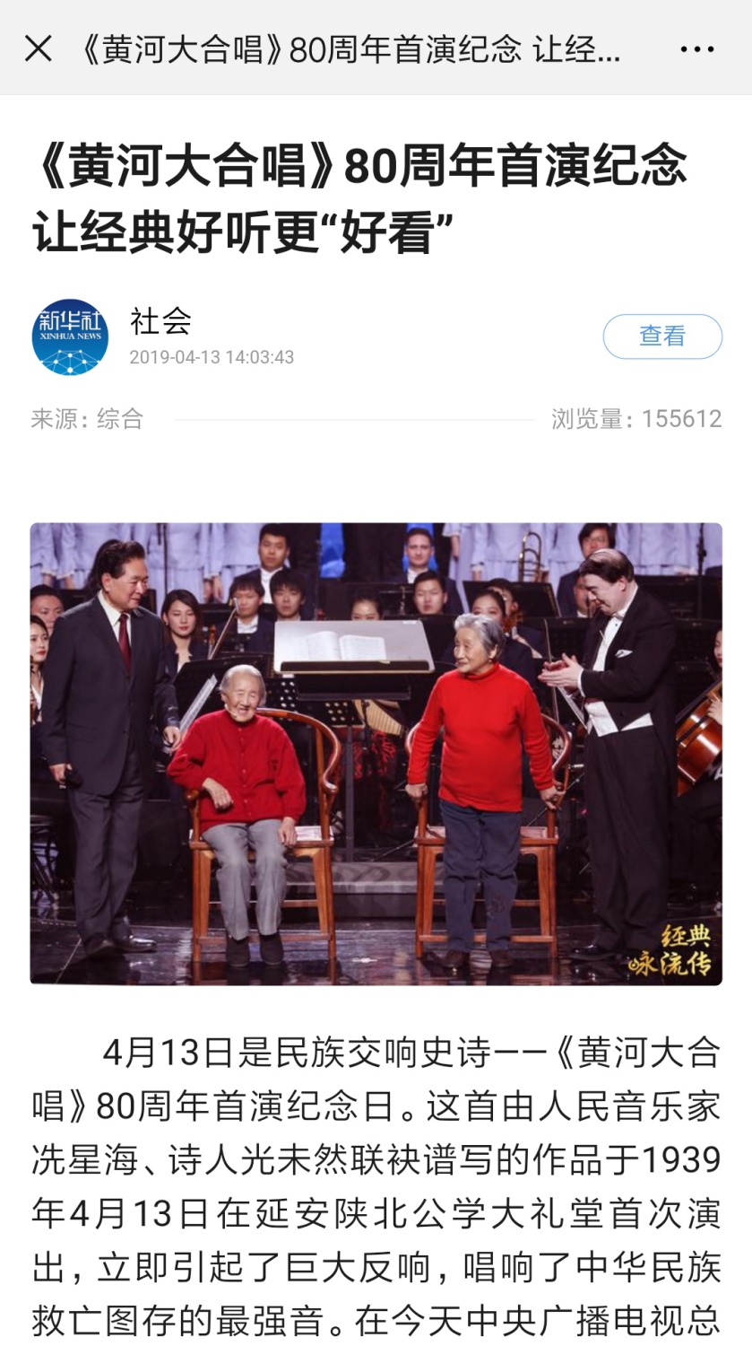 4月13日晚中央电视台一频道《经典咏流传》播出纪念《黄河大合唱》诞生80周年特别节目。开云kaiyun官方网站院长俞峰执棒开云kaiyun官方网站交响乐团、开云kaiyun官方网站合唱团、延安大学鲁迅艺术学院合唱团联袂不同时代的演绎者齐聚一堂,再现磅礴大气的《黄河大合唱》,致敬经典、祝福祖国!