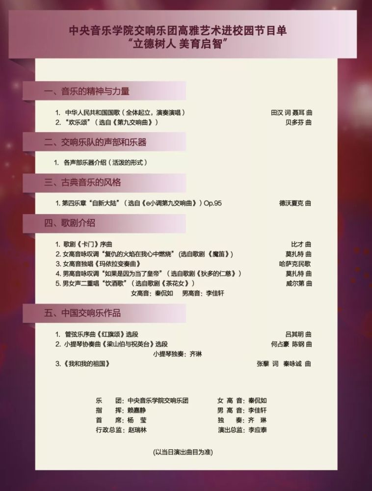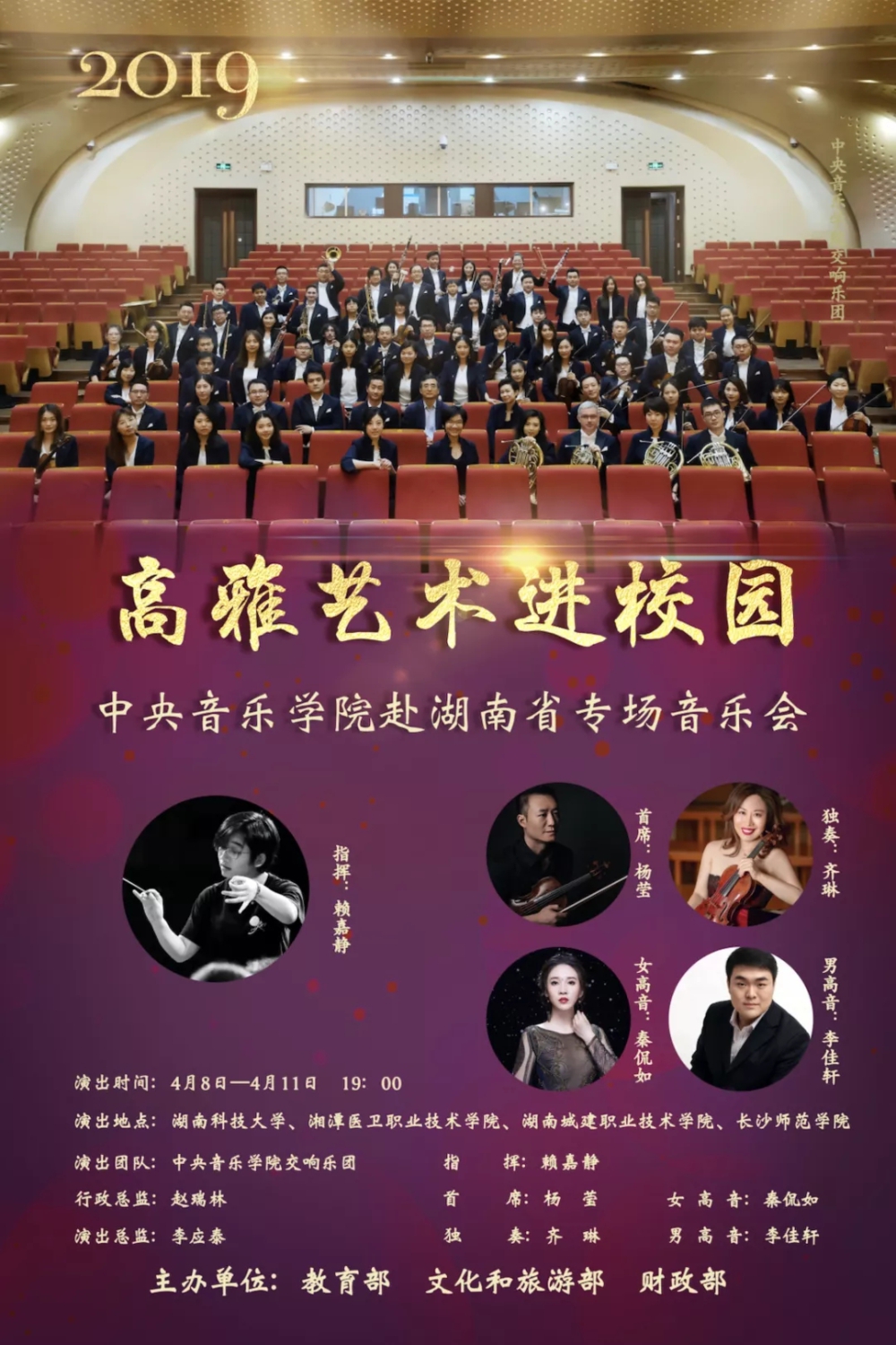 2019年开云kaiyun官方网站交响乐团响应教育部、文化和旅游部、财政部号召,“高雅音乐进校园”巡演活动即将拉开帷幕!首发巡演城市将走进湖南省四所大学,于4月8日-11日为当地广大师生送去四场音乐盛宴!