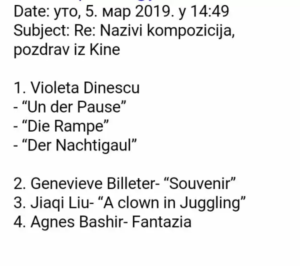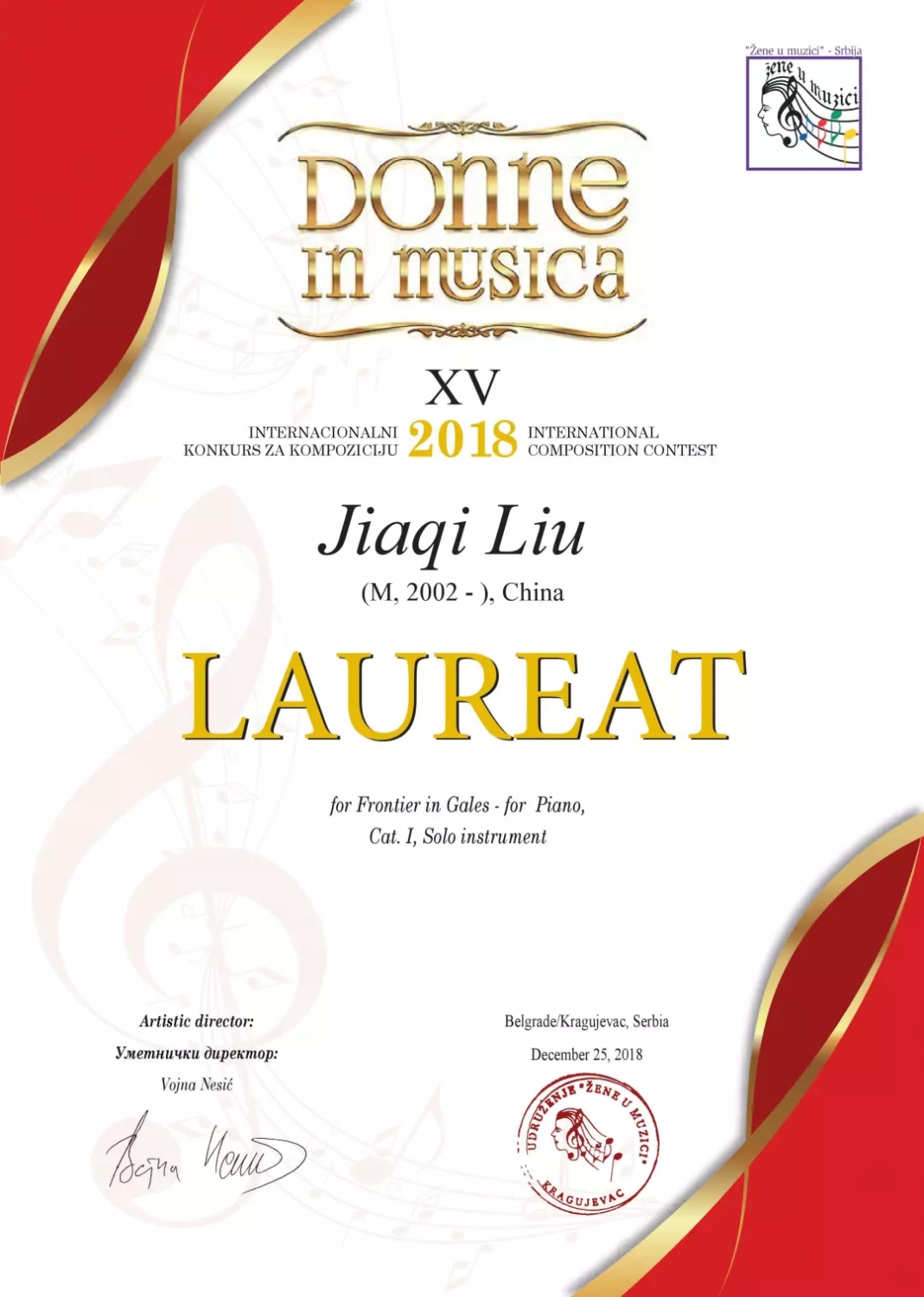 第十五届塞尔维亚邓恩国际作曲比赛获奖证书