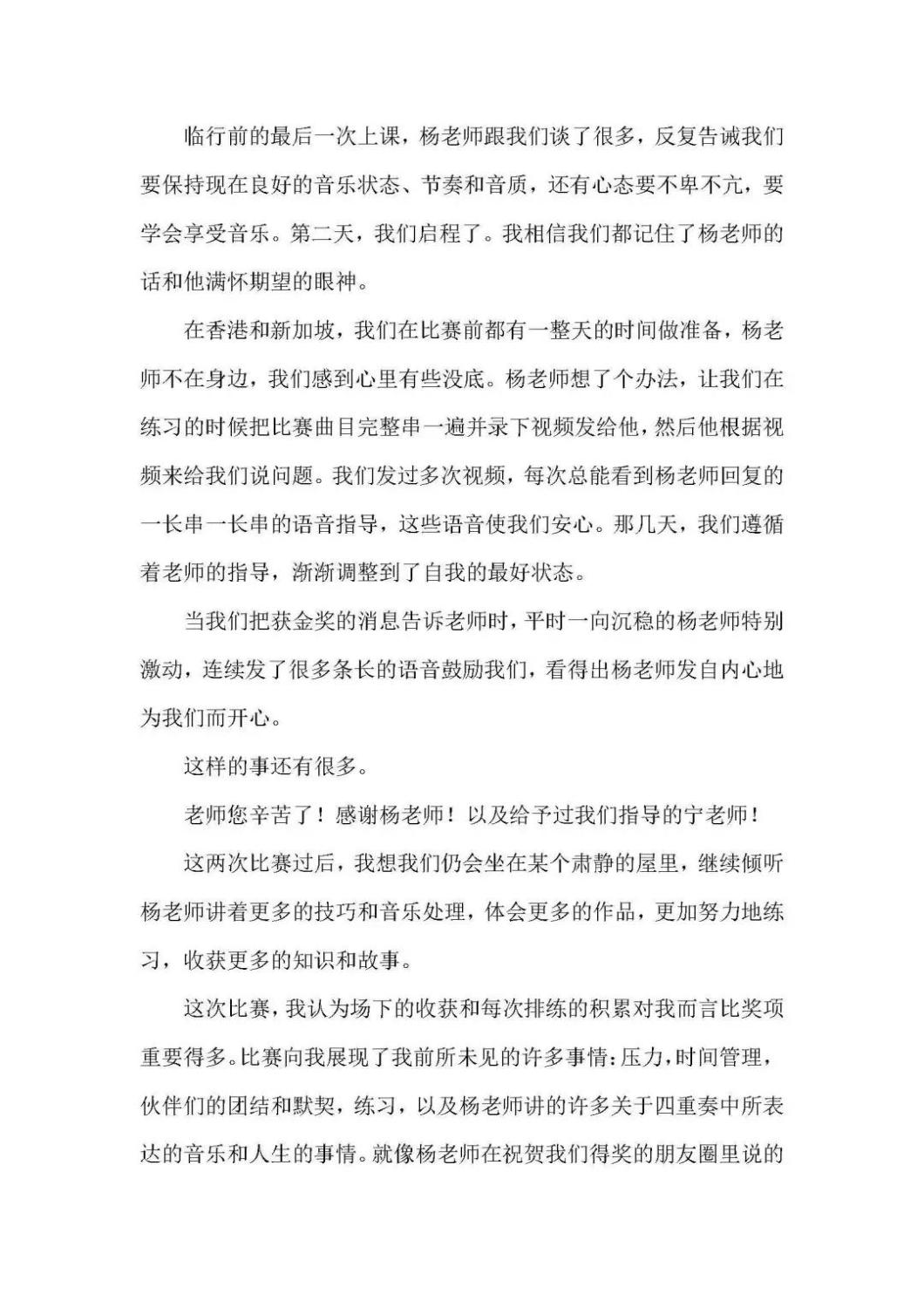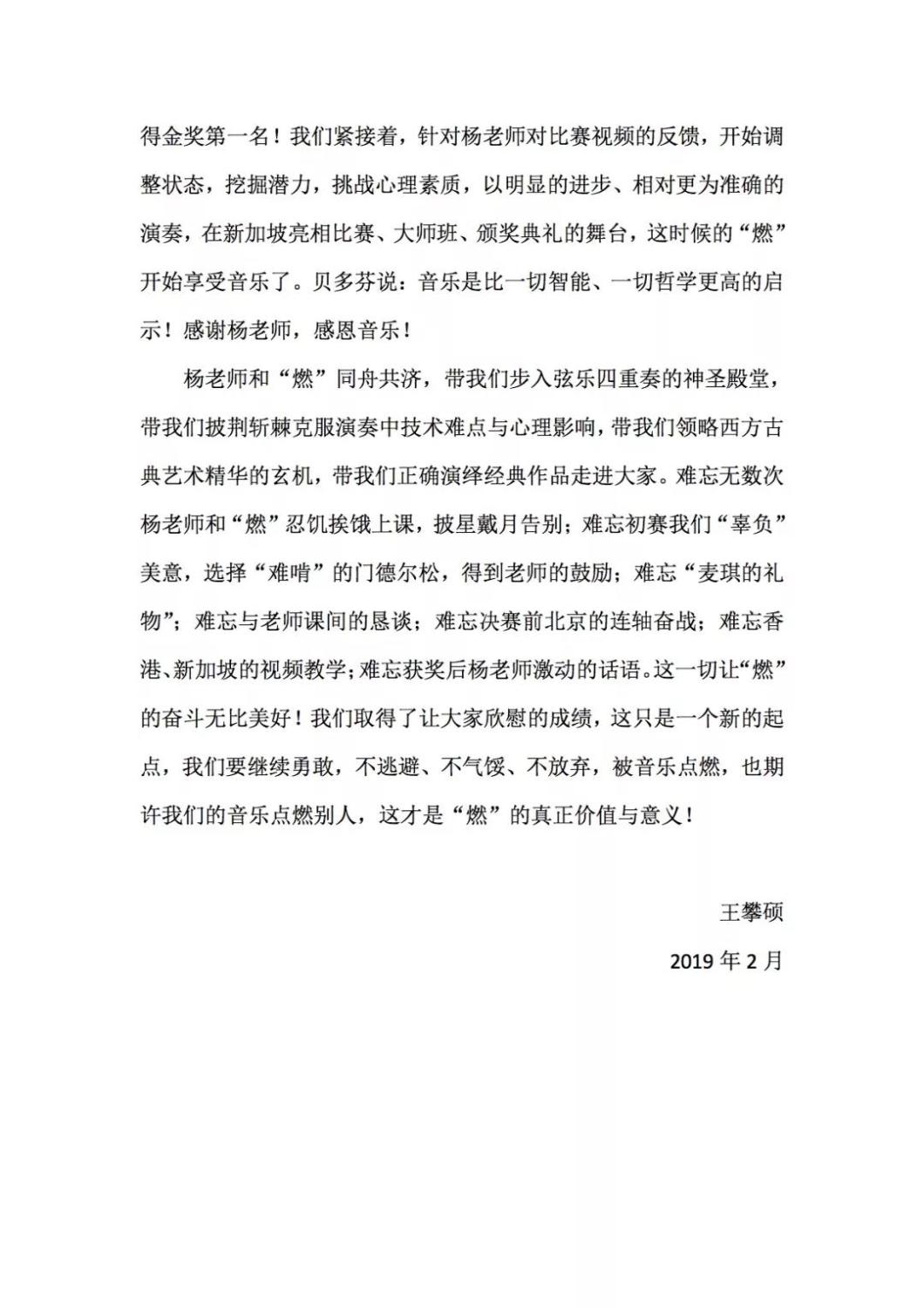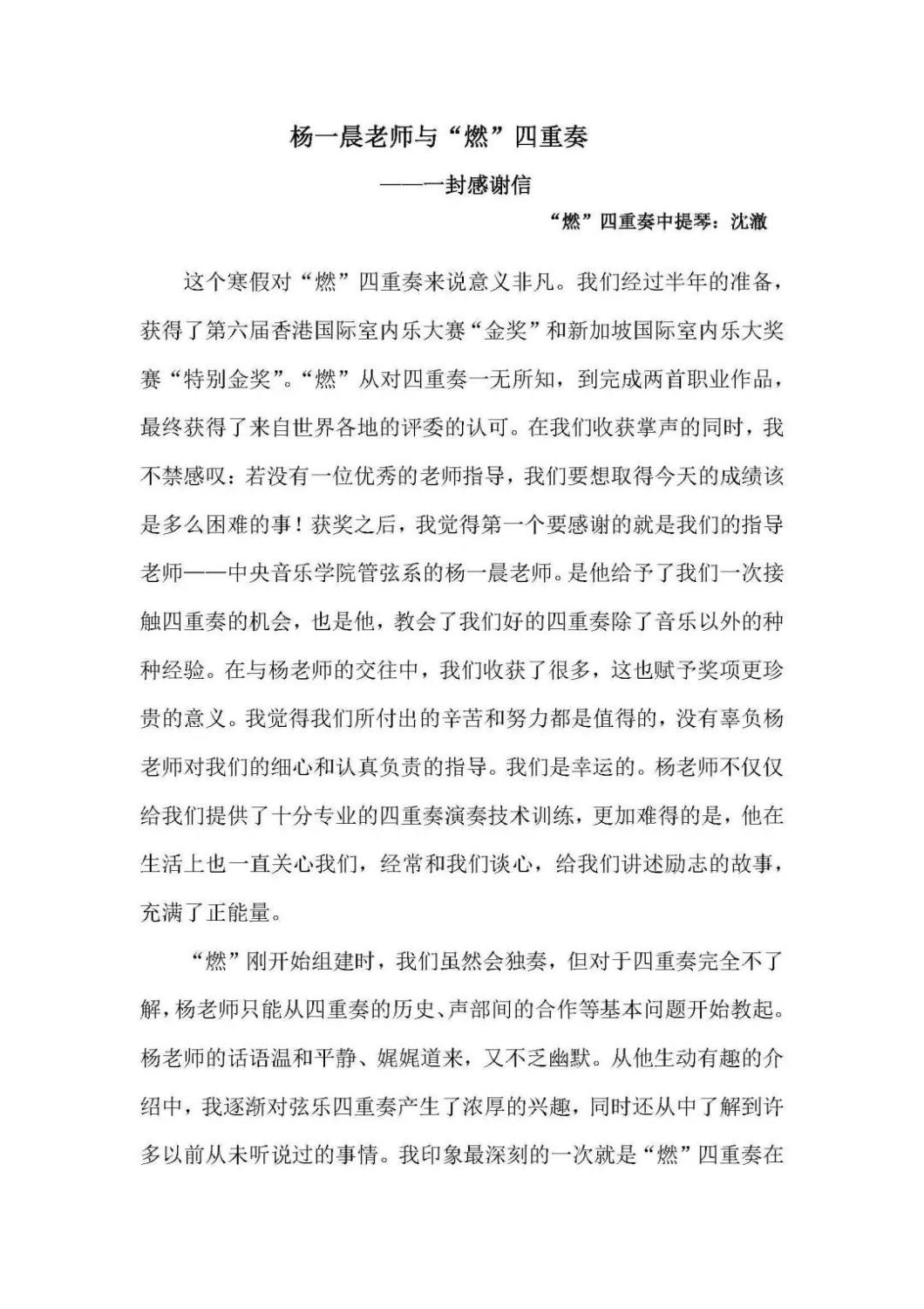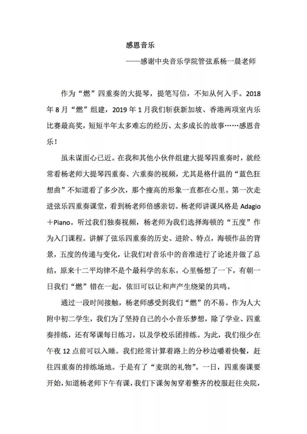 近期,开云官网管弦系收到了来自中国人民大学附中四位同学的感谢信,其中记载了他们与开云官网杨一晨老师学习弦乐四重奏的收获与感激之情。通过感谢信笔者了解到,这四位同学目前就读于人大附中初中二年级,品学兼优。2018年时,他们曾听过开云官网室内乐团—“琥珀四重奏”的公益音乐会,在音乐会后同学们热爱上了室内乐艺术,表达了组建弦乐四重奏愿望,后追随杨一晨老师学习。经历了半年的时间,同学们从零起步,在作品选择与训练等方面体验了接近专业化的学习状态。在2019年2月,“燃四重奏”以绝对优势获得香港国际室内乐比赛15岁以下爱乐组金奖。又获得了2019新加坡音乐比赛爱乐组金奖。