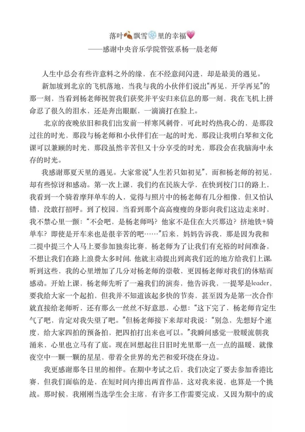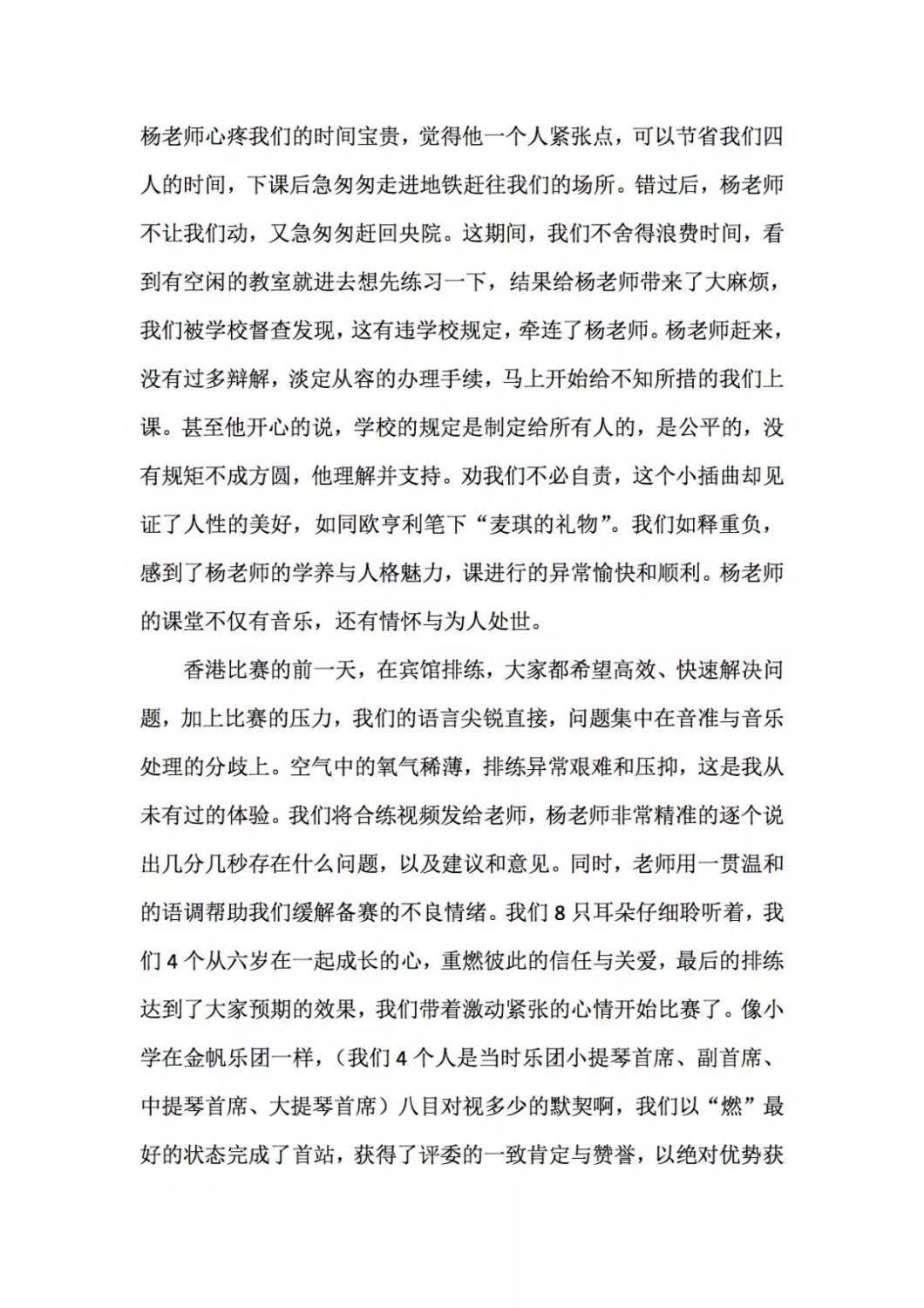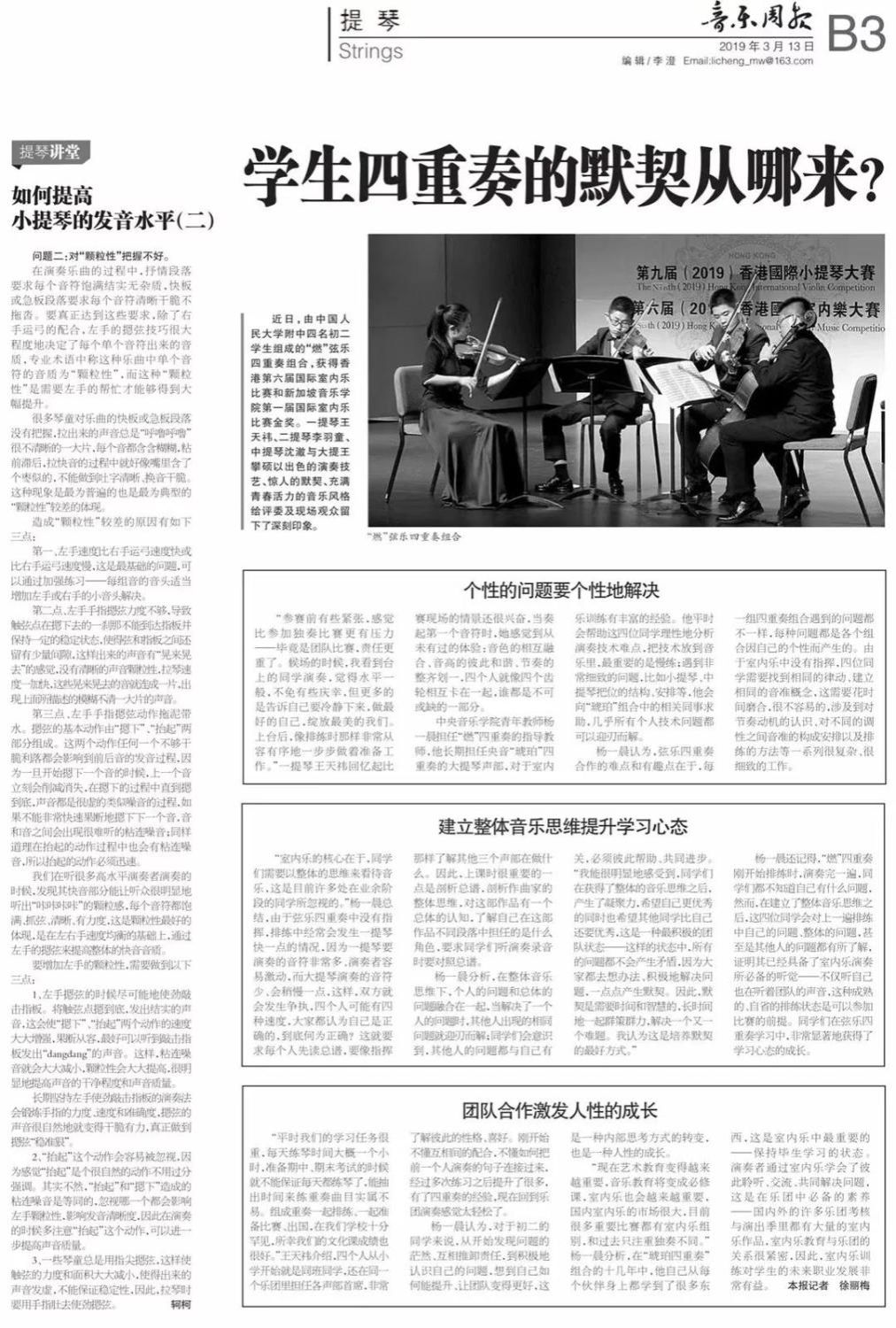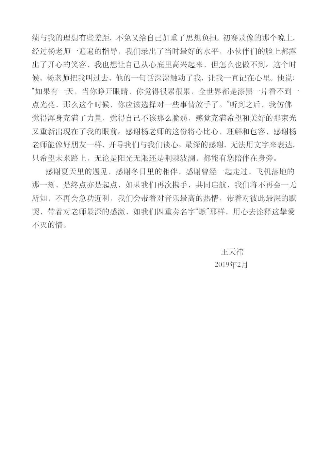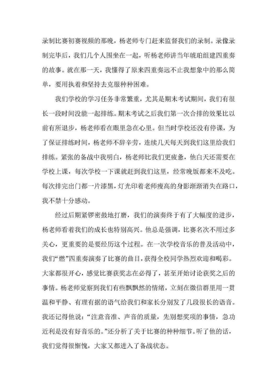 近期,开云官网管弦系收到了来自中国人民大学附中四位同学的感谢信,其中记载了他们与开云官网杨一晨老师学习弦乐四重奏的收获与感激之情。通过感谢信笔者了解到,这四位同学目前就读于人大附中初中二年级,品学兼优。2018年时,他们曾听过开云官网室内乐团—“琥珀四重奏”的公益音乐会,在音乐会后同学们热爱上了室内乐艺术,表达了组建弦乐四重奏愿望,后追随杨一晨老师学习。经历了半年的时间,同学们从零起步,在作品选择与训练等方面体验了接近专业化的学习状态。在2019年2月,“燃四重奏”以绝对优势获得香港国际室内乐比赛15岁以下爱乐组金奖。又获得了2019新加坡音乐比赛爱乐组金奖。