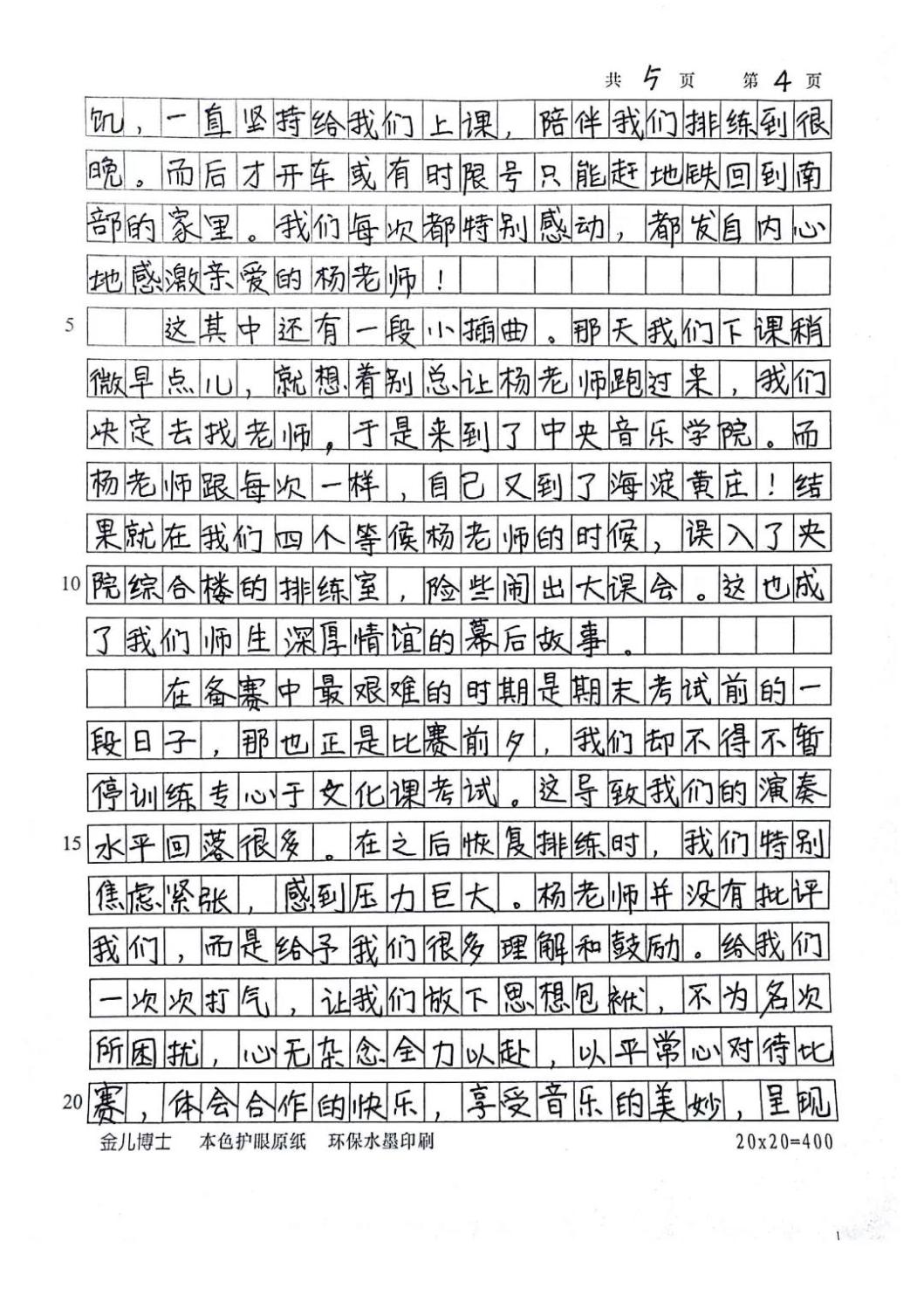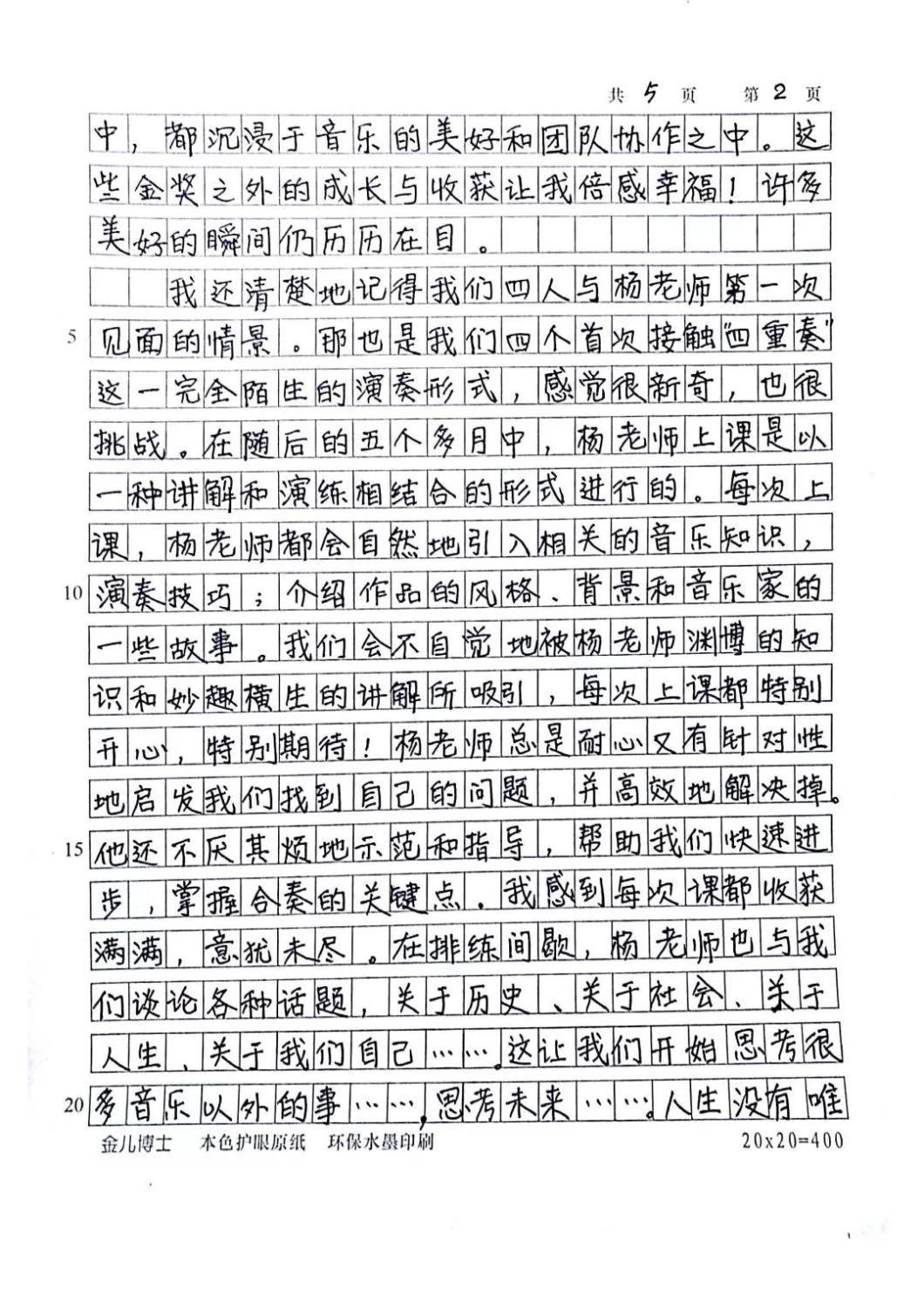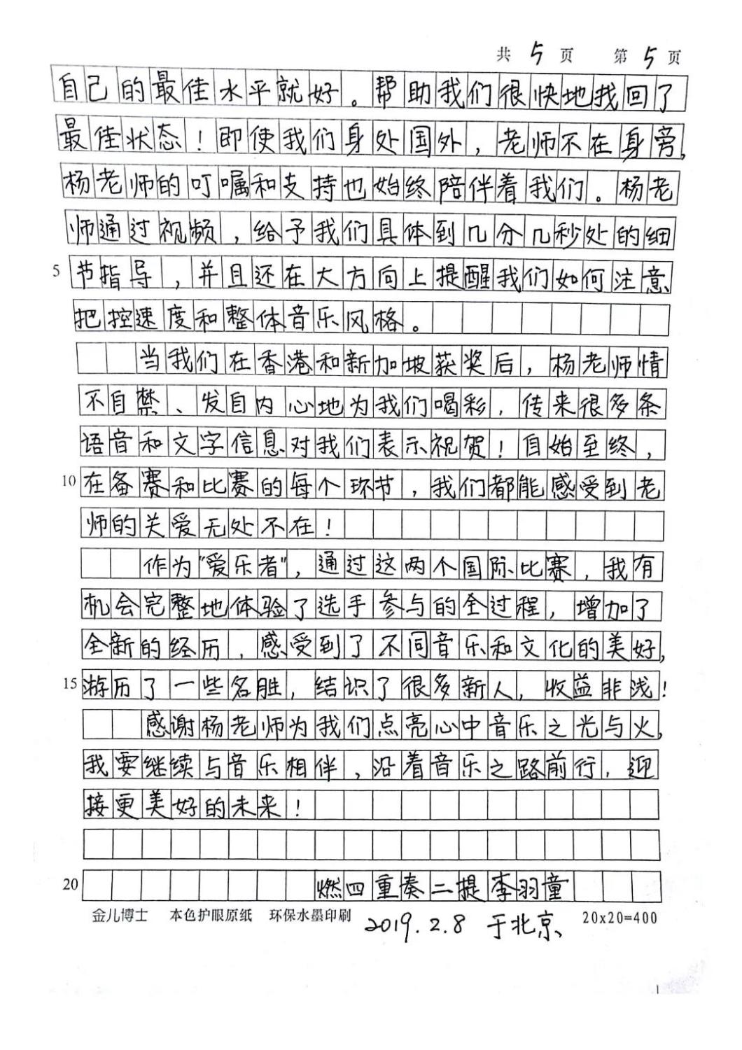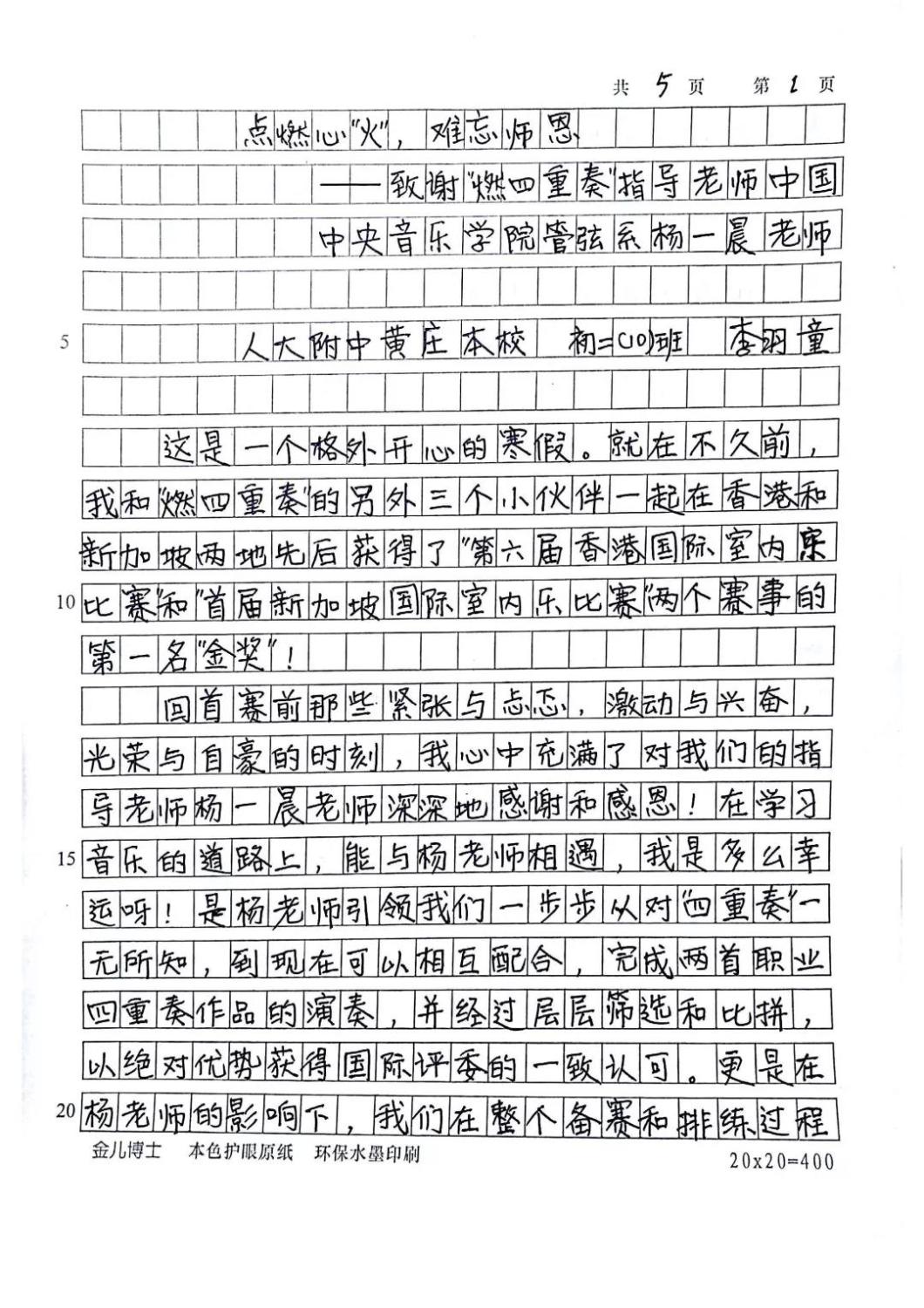 近期,开云官网管弦系收到了来自中国人民大学附中四位同学的感谢信,其中记载了他们与开云官网杨一晨老师学习弦乐四重奏的收获与感激之情。通过感谢信笔者了解到,这四位同学目前就读于人大附中初中二年级,品学兼优。2018年时,他们曾听过开云官网室内乐团—“琥珀四重奏”的公益音乐会,在音乐会后同学们热爱上了室内乐艺术,表达了组建弦乐四重奏愿望,后追随杨一晨老师学习。经历了半年的时间,同学们从零起步,在作品选择与训练等方面体验了接近专业化的学习状态。在2019年2月,“燃四重奏”以绝对优势获得香港国际室内乐比赛15岁以下爱乐组金奖。又获得了2019新加坡音乐比赛爱乐组金奖。