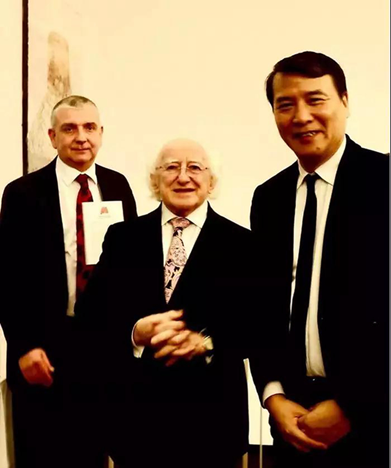 音乐会前,爱尔兰总统希金斯同中国驻爱尔兰大使岳晓勇、作曲家叶小纲教授、北京演艺集团总经理助理董宁亲切交流。