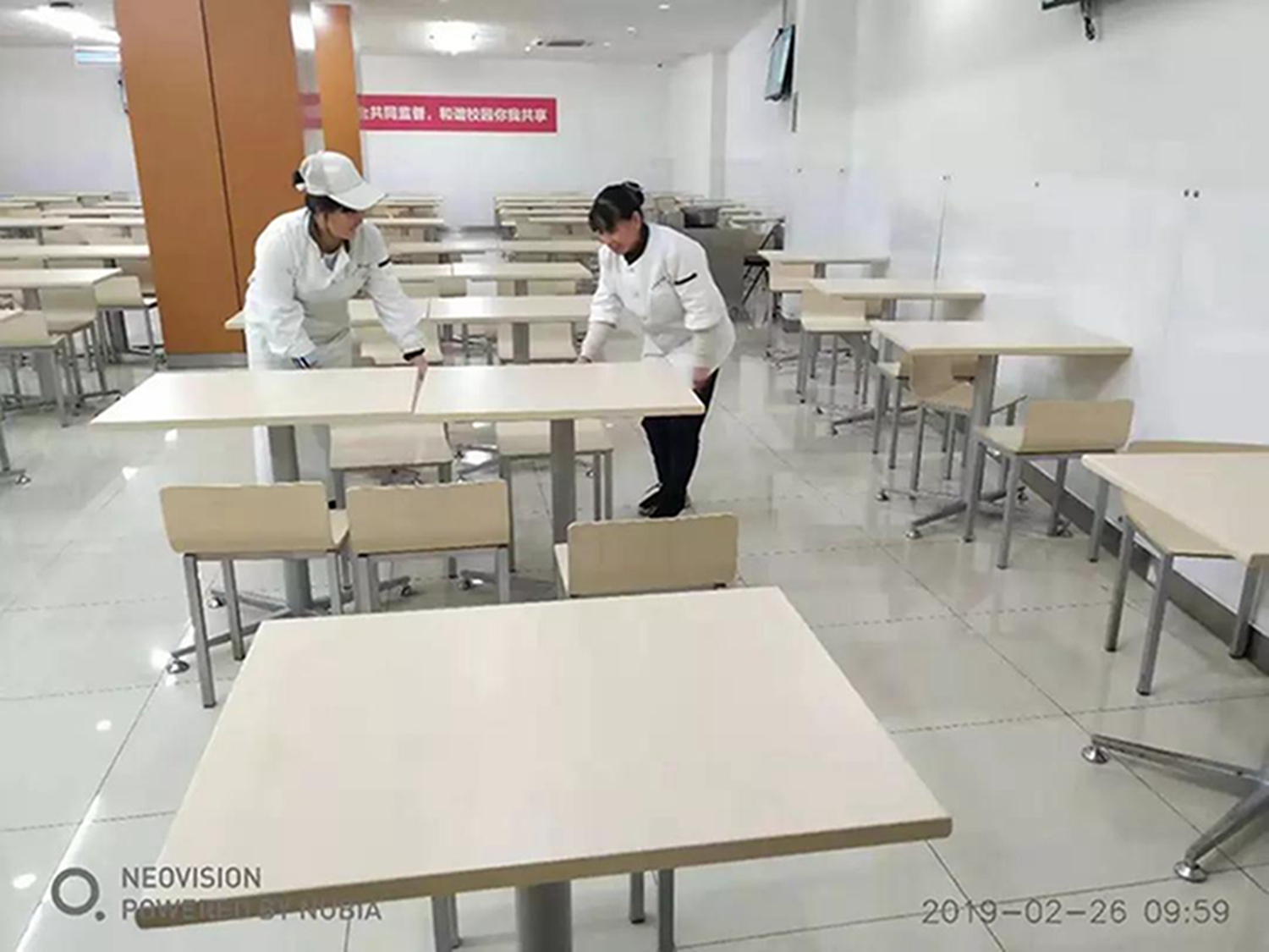 为确保师生用餐安全,开学前,食堂管理人员对食堂工作认真部署,各食堂员工彻底清洗食堂餐具、厨具、打扫地面和清洁餐桌椅,确保饭堂内干干净净,不留卫生死角。