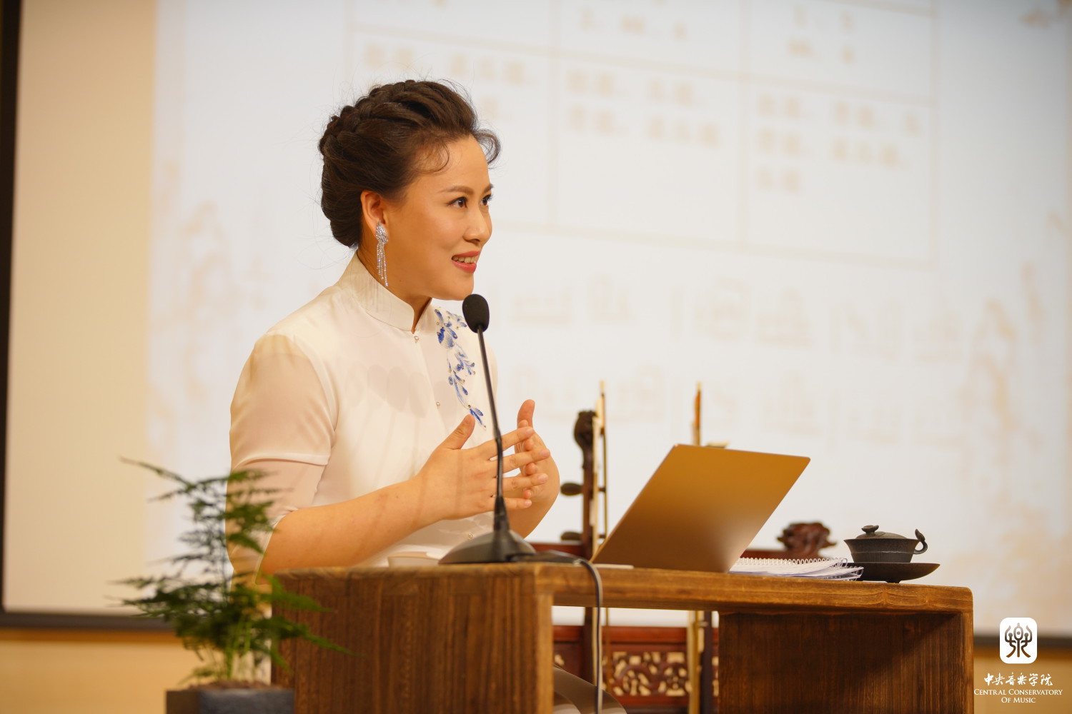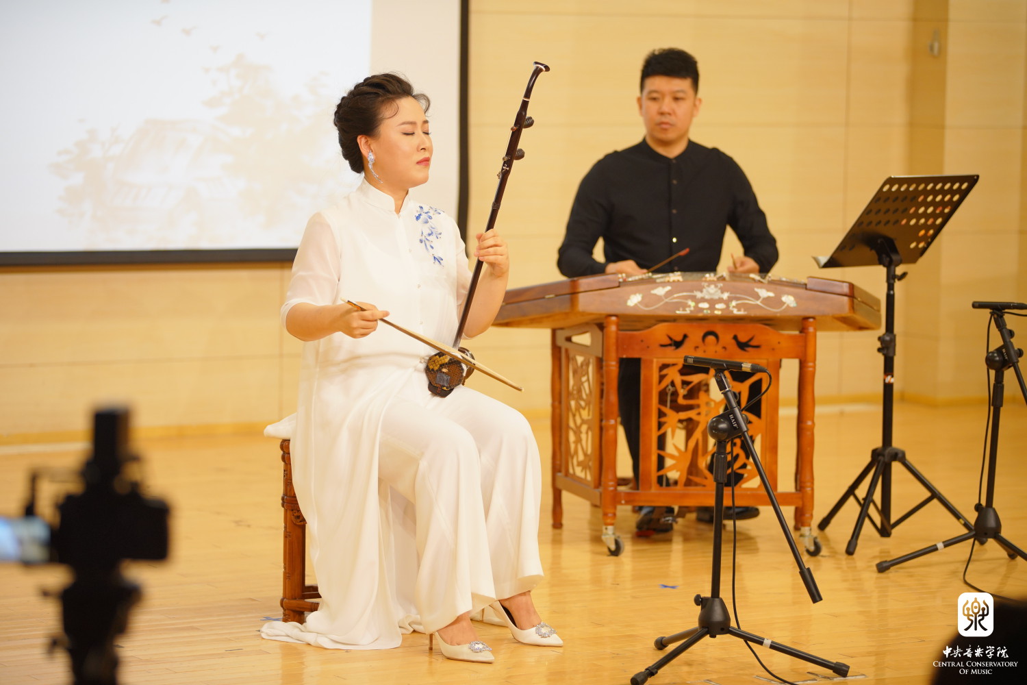 赵元春的讲座音乐会题为《丝弦上的中国》,以“韵味”作为整场讲座的主题,共分为五个部分,分别是:润腔之韵味;声腔之韵味;色彩音之韵味;音色之韵味以及“手音儿”之韵味。在每一个部分的演讲及演奏中都以不同风格的作品作为范例,充分展现出了胡琴在诠释地方风格音乐上的多样性。音乐会中,赵元春与特邀二胡助奏何娜老师、扬琴伴奏刘音璇副教授、打击乐伴奏魏然老师一起,共同演奏了《眉户调》《江河水》《一枝花》,广东音乐《昭君怨》,江南丝竹《慢三六》和板胡曲《河南梆子腔》这六首不同地方风格的胡琴代表作品。讲座中,她提出了自己在胡琴演奏地方风格性作品之韵味上的独特思考,同时也充分展现出了她深厚的中国传统文化内涵和精湛的技术功底。