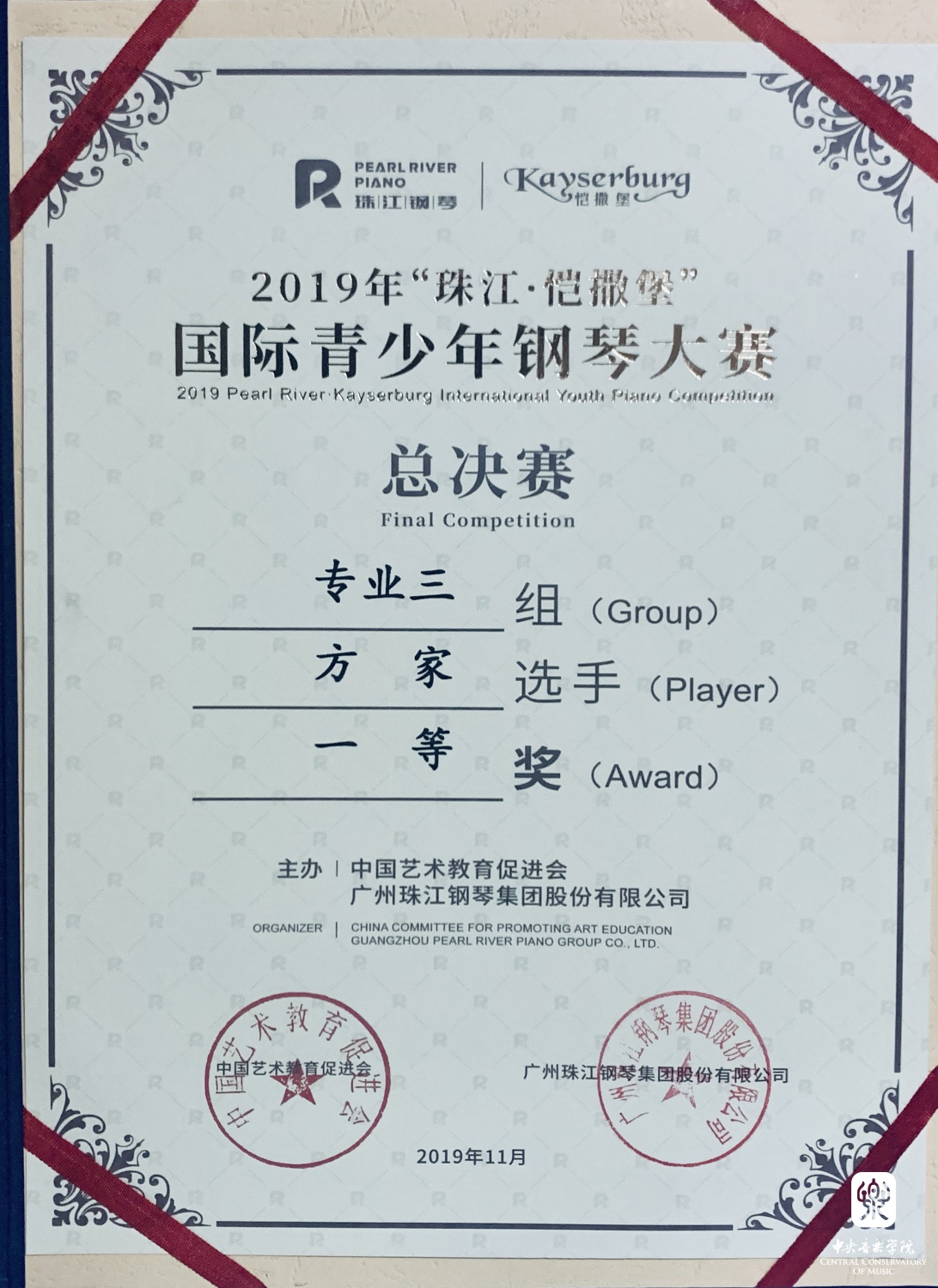 11月11日晚,由中共广州市委宣传部指导,中国艺术教育促进会、珠江钢琴集团主办的2019年“珠江·恺撒堡”国际青少年钢琴大赛总决赛圆满闭幕。此次大赛由著名钢琴家刘诗昆担任评委会主席,评委由两位范·克莱本金奖得主Vladimir Viardo、Stanislav Ioudenitch 及国内著名钢琴家组成。最后,经过激烈的角逐,开云官网钢琴系本科二年级学生方家同学(指导教师:韦丹文)以表现力极强的演奏获得评委会的认可,获得第一名。