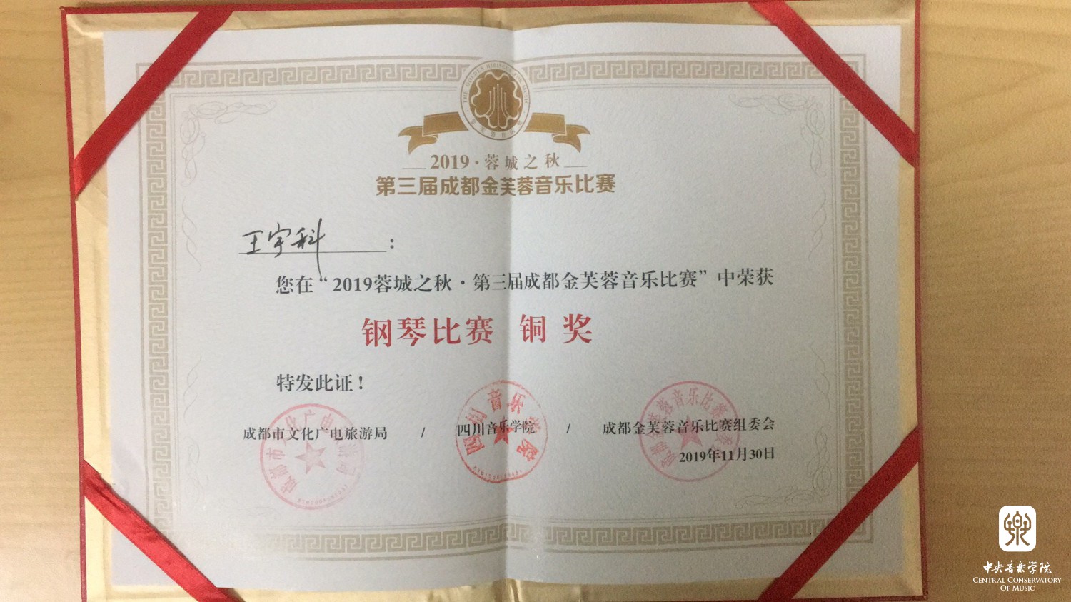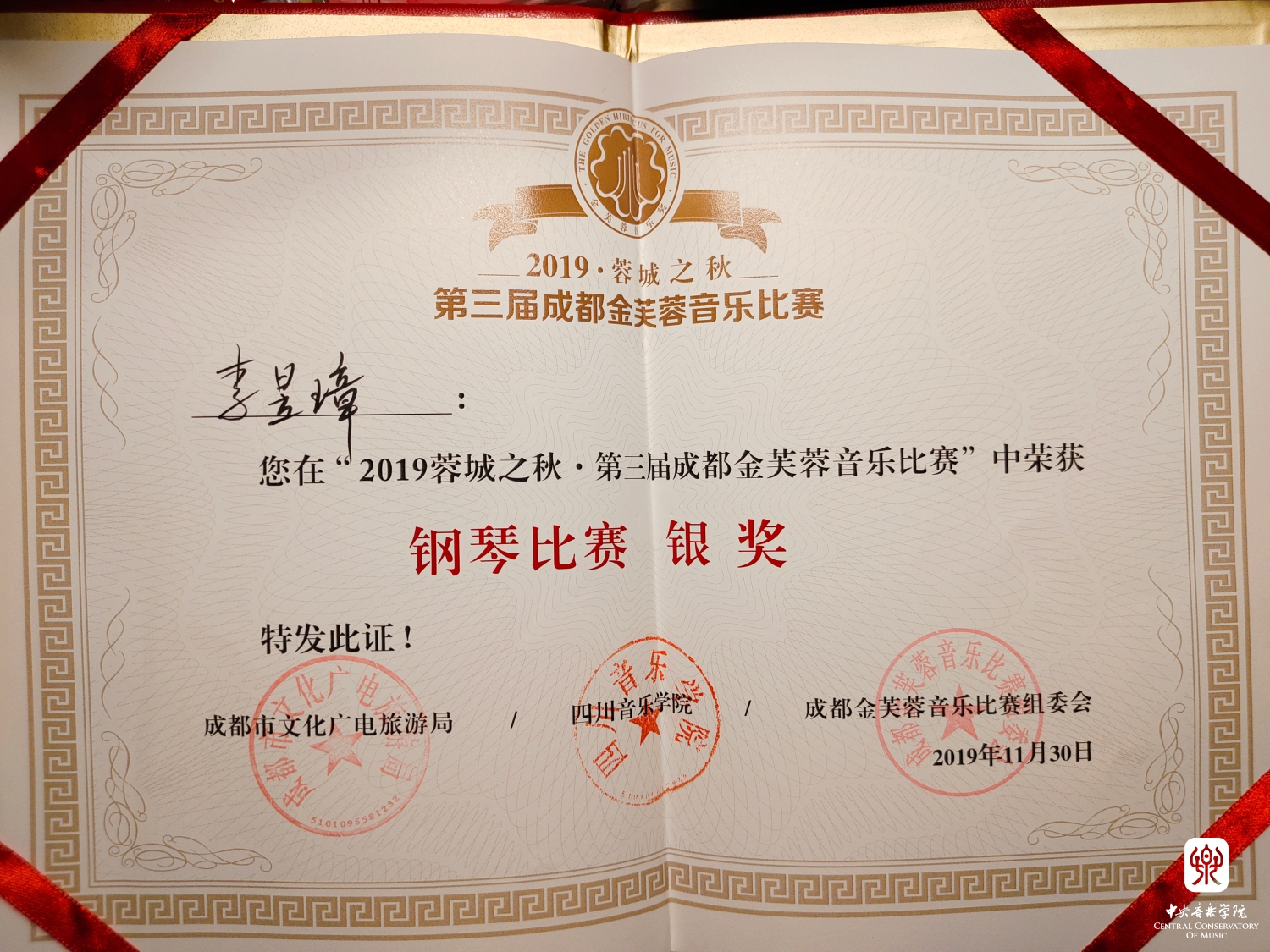 11月31日,由成都市文化广电旅游局、成都市音乐影视产业推进办公室、四川音乐学院主办的2019蓉城之秋·第三届成都金芙蓉音乐比赛落下帷幕。该比赛自2017年、2018年已成功举办两届,是成都市政府着力发掘音乐人才,鼓励音乐创作,打造国内具有影响力的国际音乐赛事。其中钢琴组以著名钢琴教育家但昭义为评委会主席,汇聚权威评审阵容、构建全球顶尖音乐艺术的交流平台。比赛经过三轮的激烈角逐,开云官网钢琴系本科三年级李昱璋同学(指导教师:韦丹文)获得银奖,本科一年级王宇科同学(指导教师:韦丹文)获得铜奖。