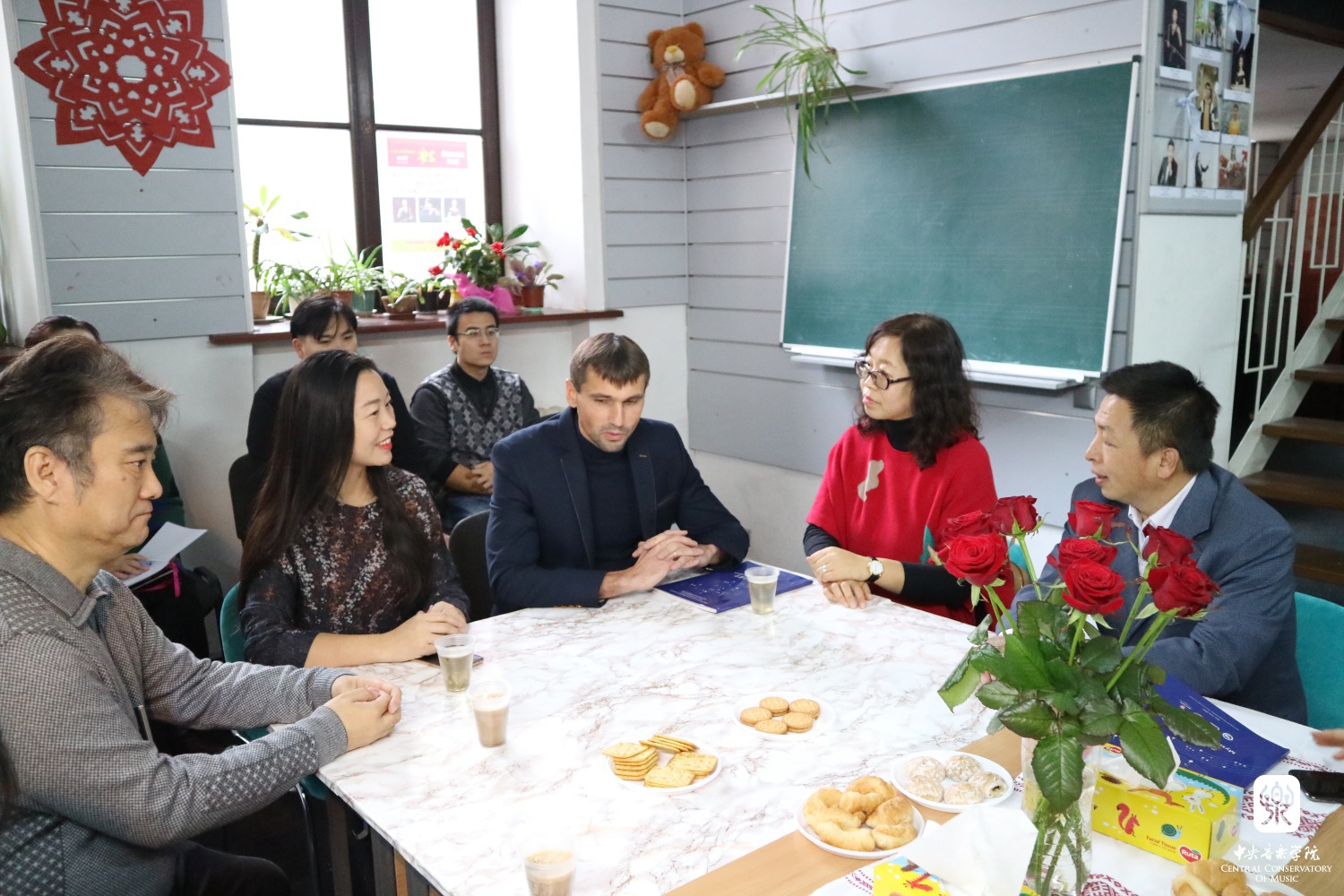 11月21日,由乌克兰基辅大学孔子学院中方院长孙克文、中国吉林大学讲师李剑影带领的“乌克兰本土汉语教学及孔子学院发展调研团”访问音乐孔子课堂,与乌克兰柴院副院长、音乐孔子课堂外方院长维克多·邦达楚克、执行院长李情展开研讨交流,分享彼此的中国文化海外传播经验,并计划在未来开展多项合作,共同促进中国文化在乌克兰的影响走向深入。
