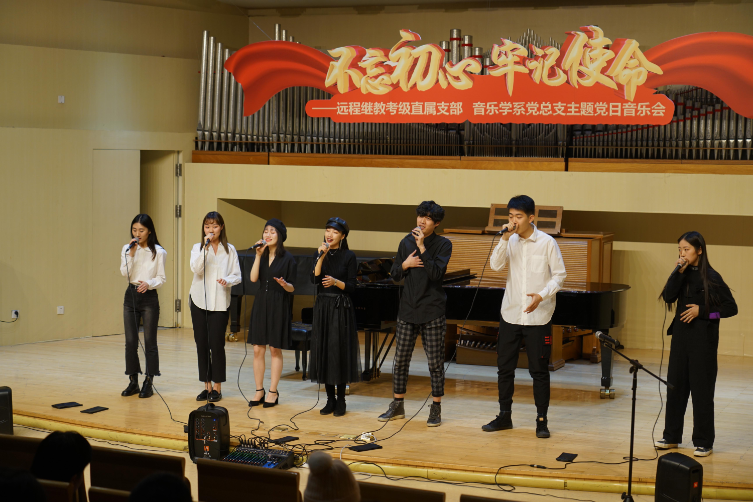 最后一个篇章“牢记使命”,与开篇呼应,选取了数首经典歌曲,或作改编、或作再演绎,像一段段纪录片,再现了共和国70年征程中闪亮的日子。韩瀚老师为此次主题党日音乐会专门改编的、由作曲系张帅老师为建国70周年创作的歌曲《祝你生日快乐》引发了在场观众的强烈共鸣。很多观众虽是第一次聆听,但这首歌直抒胸臆的歌词与深情优美的旋律让大家不由自主地跟着一起哼唱。“啊,祝你生日快乐,华夏儿女的母亲,我们深爱您……”,不同年龄、不同专业的学生们用饱含深情的歌声,唱出了对祖国共同的眷恋和真情。