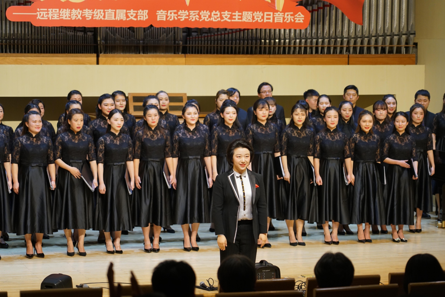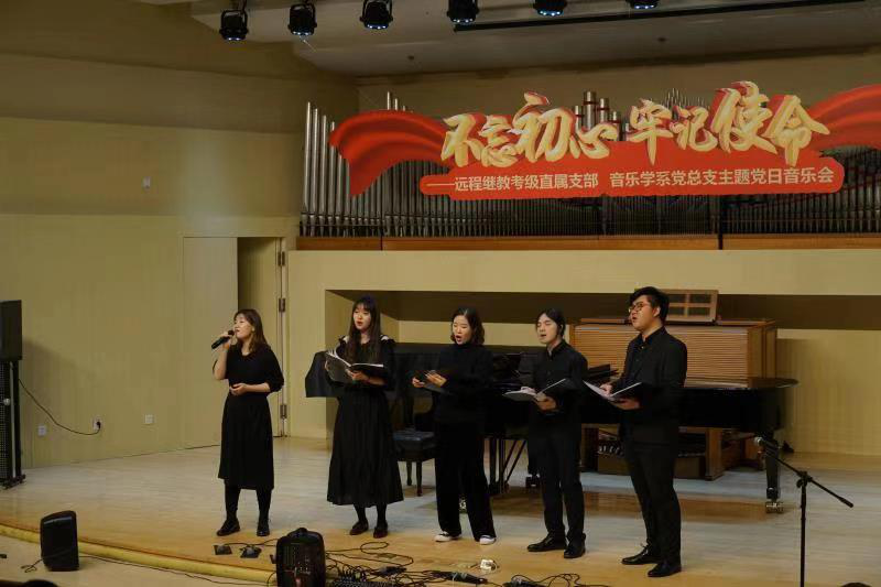 音乐学系党总支书记吴晓萍同志代表活动主办单位致辞,她说,为深入学习贯彻习近平新时代中国特色社会主义思想,全面贯彻党的教育方针,落实立德树人根本任务,远程继教考级直属支部和音乐学系党总支组织开展了一系列思想教育活动。同时,我们大胆创新、积极探索,将党建与科研教学、党建与专业实践深度融合,在韩瀚老师开设的“合唱文献导读”选修课等课程中融入思想教育元素,结合时政热点,对新中国成立时期和新时代时期的作品进行分析和演唱,进一步推动新时代精神进课堂、进舞台、进头脑。这种将思想政治教育“润物细无声”地融入课堂教学,可以说是对教育部所倡导的“课程思政”的生动实践,是非常有益的探索和尝试。未来我们要继续发挥党支部的战斗堡垒作用和党员的先锋模范作用,“不忘初心,牢记使命”,努力在创建世界一流大学方面走在前列,为实现中华民族伟大复兴的中国梦作出新的更大的贡献。