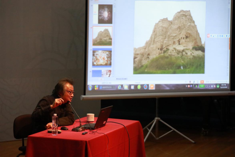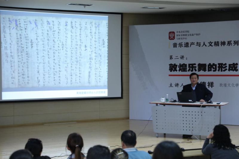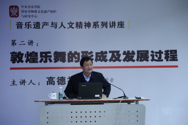 高德祥先生通过丰富的历史资料和影像图形,从敦煌石窟的形成年代、修建规模、文物价值等多方面对敦煌石窟进行了全面的阐释——通过对于石窟中大量壁画彩绘的分析研究,对于古代乐舞的体裁形式、乐器形制、乐谱遗存与演奏方法等方面,给予了深入的讲解。最后,高德祥先生也为敦煌石窟由于各种原因的流失与损毁,再次表示深深的抱憾与惋惜,同时也再次呼吁对于敦煌文物和非遗文物进一步的抢救与保护。