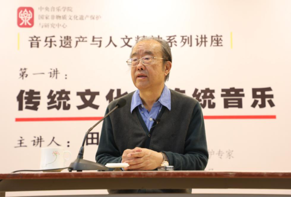 田青先生主要通过“技术与文化的关系”“非物质文化遗产保护”与“我国传统音乐现状”三个论题,讲述了音乐学院学生要特别注重文化的学习,不应只将眼光停留在技术层面的问题;其次提出了对传统文化中的“精华”与“糟粕”的思考,指出一个民族没有根,就是没有找到文化的源;同时还论述了对当今全民提倡坚定“文化自信”的认识,他将这种文化比喻为“三根支柱两层楼”,三根支柱指儒、释、道三家;第一层楼指我国所有优秀传统文化,第二层楼指的是植根于广大民众之中的“非物质文化遗产”,千百年来,它维护着中华民族的精神,传承着中华民族最可贵的遗产,因此必须要尽全力保护起来。田青先生认为我国传统音乐的价值不仅体现在音乐形态方面,更存在于其中所包含的“神韵”之中;强烈呼吁对于我国传统民族音乐的重视与学习,期望年轻学子要尊重自己民族的传统音乐、更多的学习传统音乐;作为一个中国人最起码的要求是,要掌握、了解自己的传统文化,并且引以为自豪。