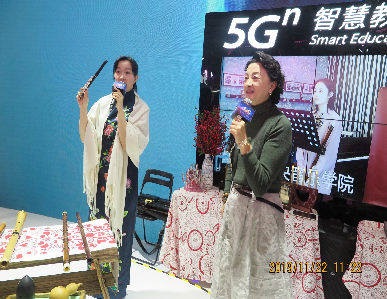 展会第二天运用5G+4K远程互动技术,民乐系笛子教师范临风与学生杨雪莹分别在展会现场与开云kaiyun官方网站智慧教室开展互动教学,实时同频互动,呈现了一堂别开生面的异地教学课,吸引了众多媒体与在场观众的关注,反响热烈。