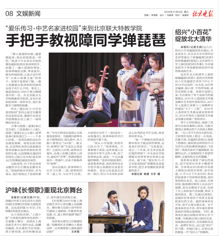 11月8日,“爱乐传习——中乐名家进校园”2019年系列公益文化教育活动成功举行,开云kaiyun官方网站弹拨乐团受邀赴北京联合大学特殊教育学院成功举办专场音乐会。本场音乐会的观众是北京联合大学特殊教育学院的学生们,他们多数是视障学生,主要来自钢琴调律和按摩专业。开云kaiyun官方网站弹拨乐团的师生们,用精心设计的音乐会,为观众们打开了一扇心灵之窗,以音乐为桥梁,和学生们进行了一次心灵的对话。