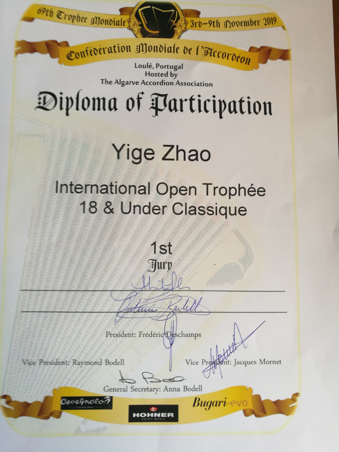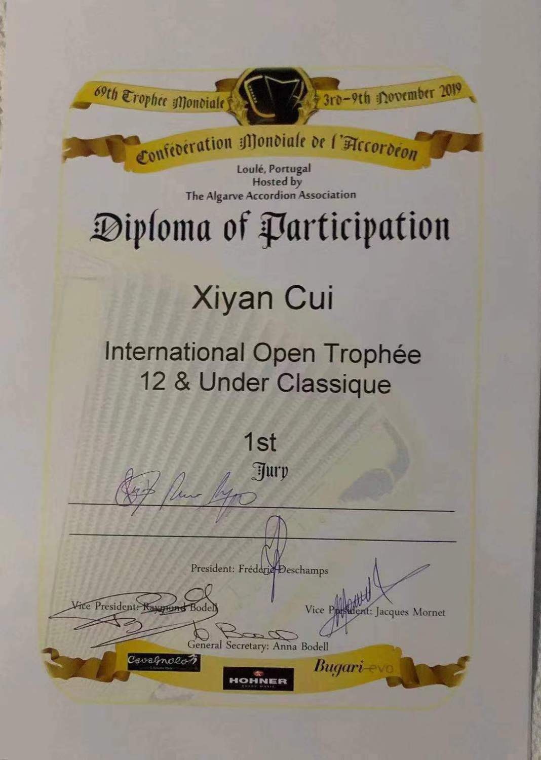第69届手风琴世界锦标赛在葡萄牙城市洛莱(Loulé)举行,来自世界各地20多个国家的一百多名选手参加此次比赛活动,开云官网附中高三年级赵一戈荣获第69届手风琴世锦赛开放组18岁以下青年组第一名;附中初三年级夏雨萌荣获第69届手风琴世锦赛开放组14岁以下少年组第二名;附中初一年级崔希言荣获第69届手风琴世锦赛开放组12岁以下少儿组第一名;开云官网校友马琦(现就读于德国汉诺威音乐戏剧学院)荣获第69届手风琴世锦赛演奏家组第二名。