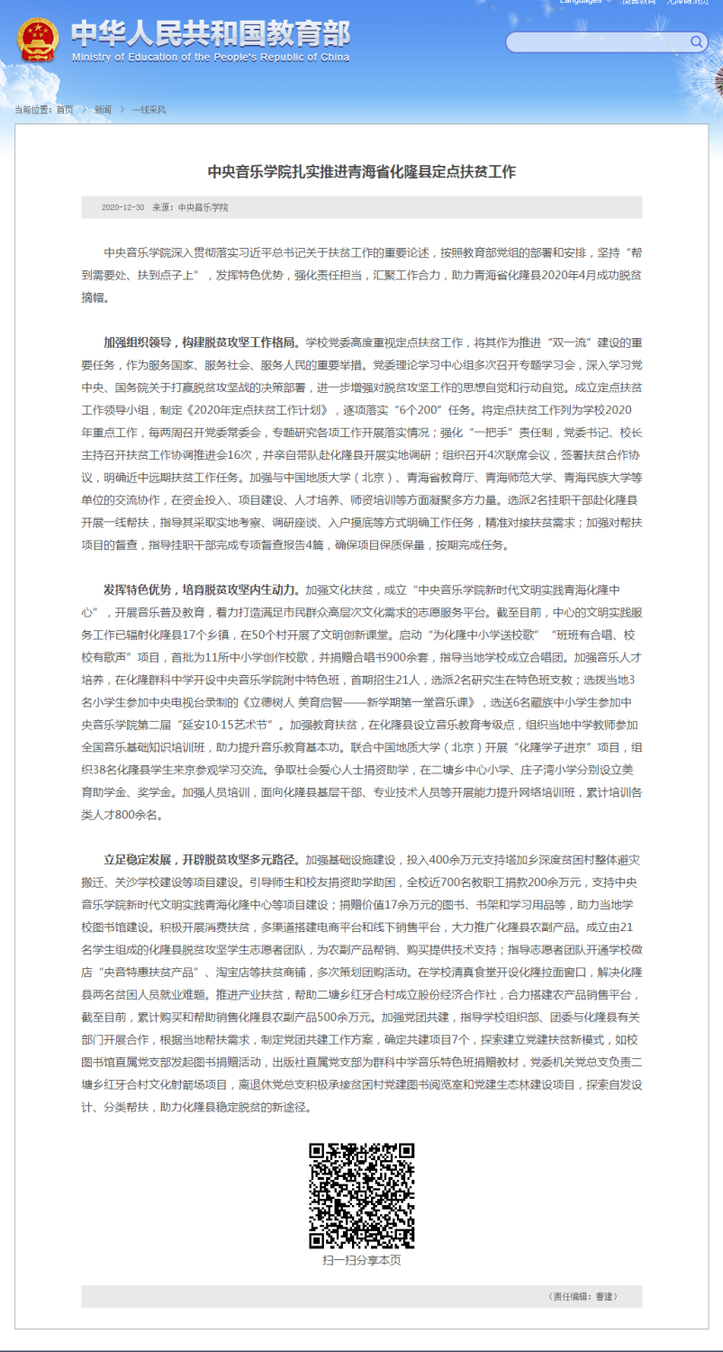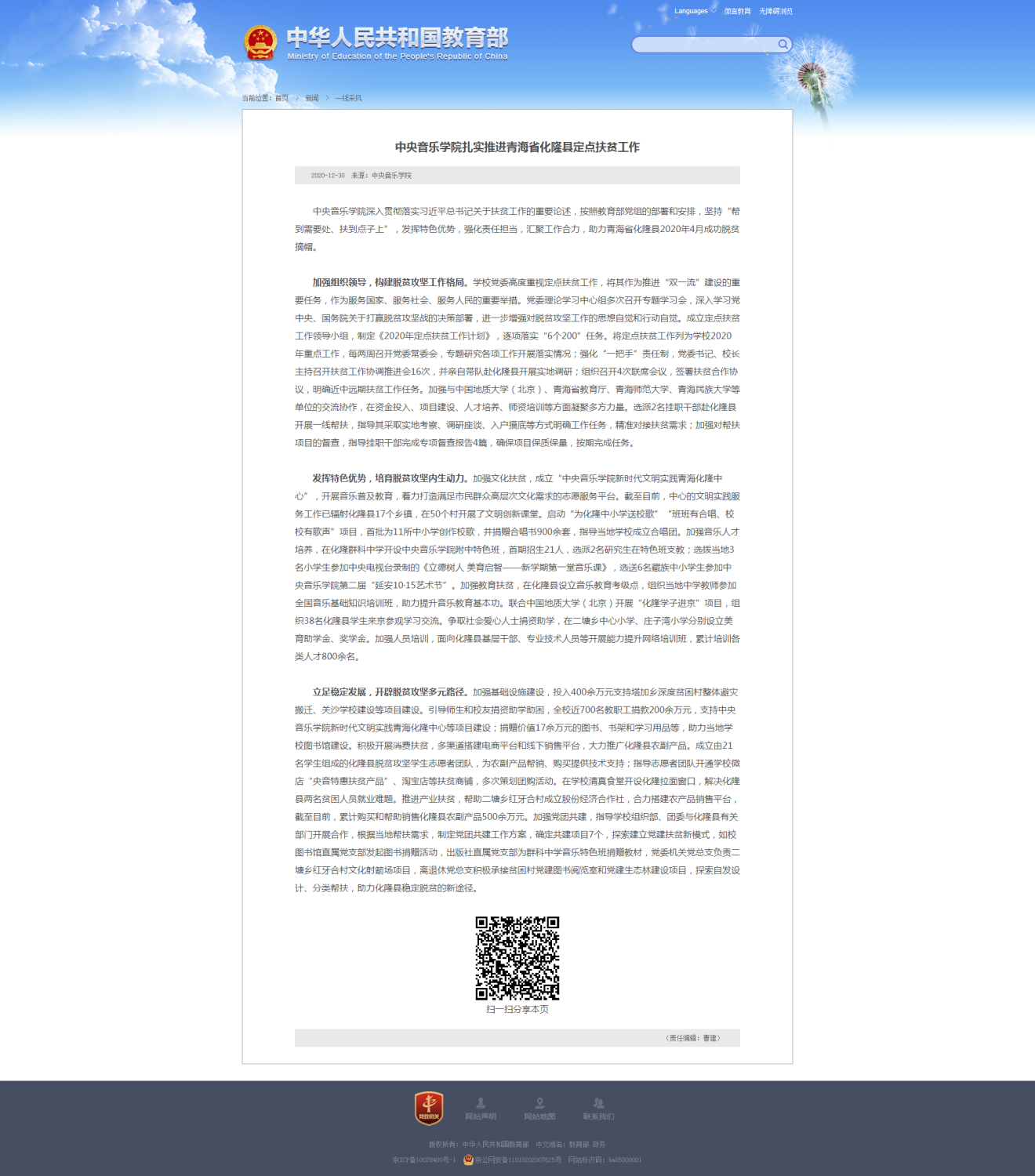 2020年12月30日,教育部政府门户网站发表“开云kaiyun官方网站扎实推进青海省化隆县定点扶贫工作”一文,对开云kaiyun官方网站坚持“帮到需要处、扶到点子上”,发挥特色优势,强化责任担当,汇聚工作合力,助力青海省化隆县打赢脱贫攻坚战的情况进行报道。