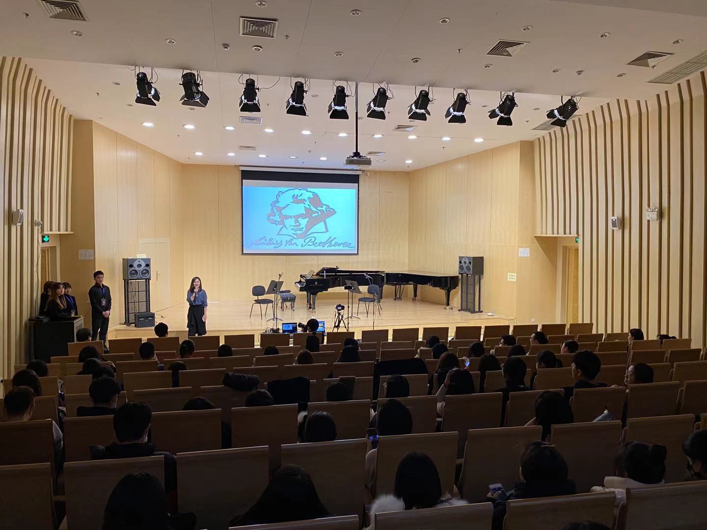本场演出吸引了许多热爱贝多芬音乐的同学们前来观看。大家热情的掌声与对音乐的热忱将1001演奏厅的气氛推至高潮。演出最后,刘小龙老师、钱亿松老师上台与演奏员、策划团队进行合影留念,本场研究生艺术实践讲座音乐会在温暖的氛围中圆满结束。