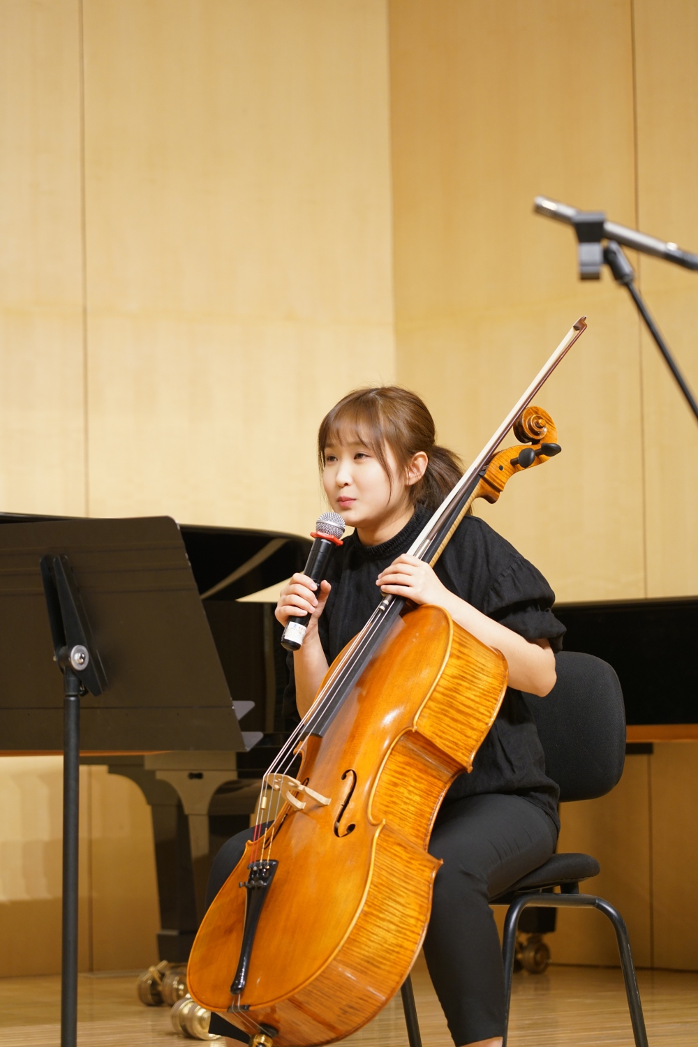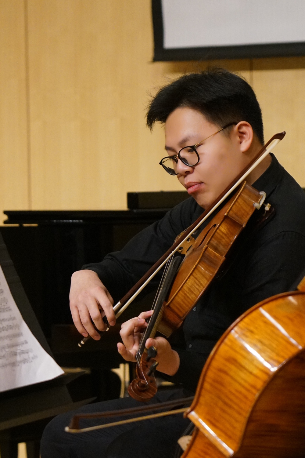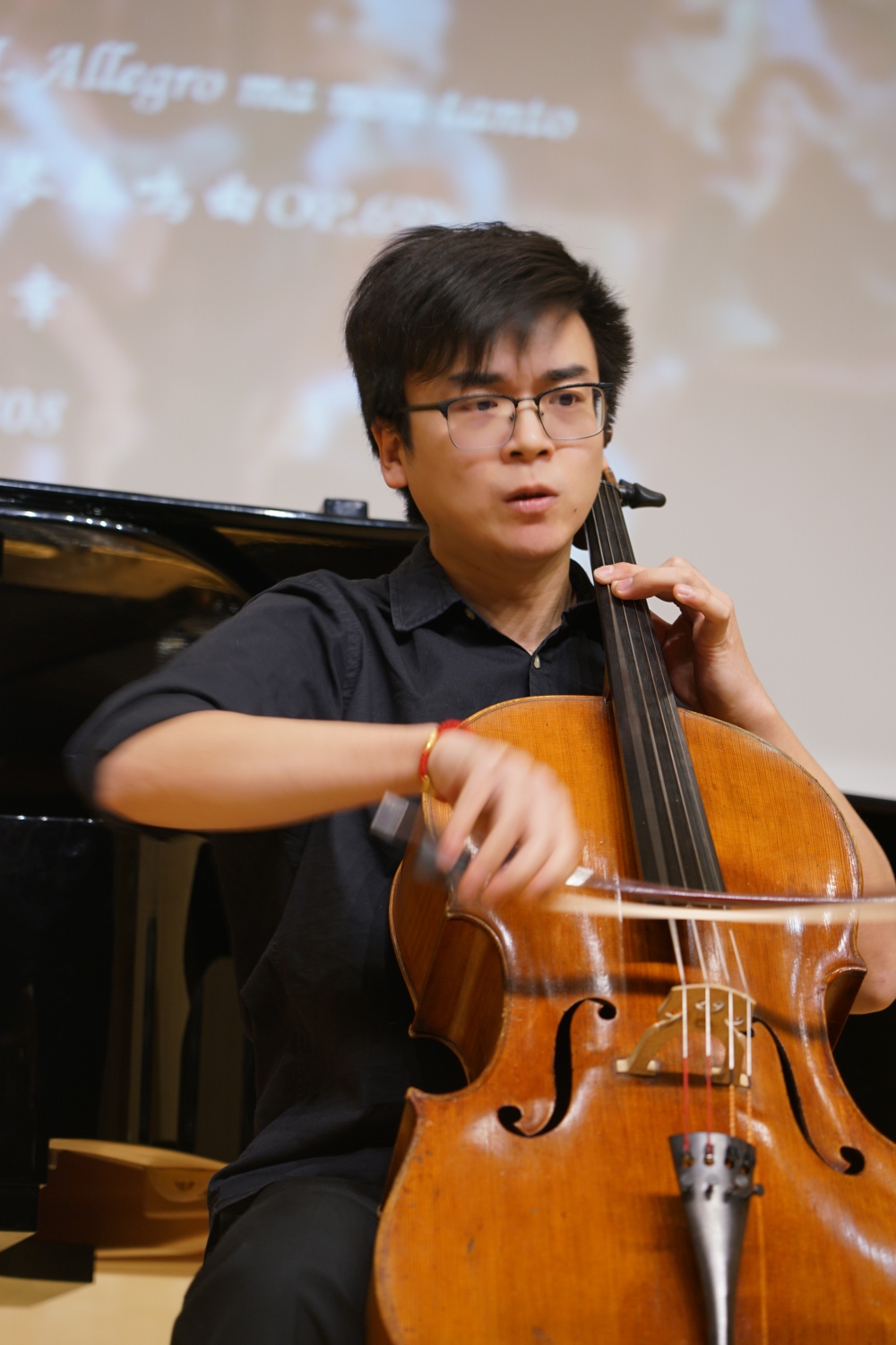 本场演出的第二首作品,是贝多芬于1808年创作的《A大调第三大提琴奏鸣曲》(Op.69),由管弦系博二学生邱树豪、研三学生沈一鸣共同演奏第一乐章。大提琴奏鸣曲是贝多芬创作中期阶段最能体现其创作多元性的一整套作品,而该作因仍存有手稿原谱而尤为珍贵。刘小龙老师提到:“贝多芬在大提琴奏鸣曲的创作过程中,将钢琴与大提琴声部轮流不断地进行改动,最后几乎形成了像两个版本一样的谱面。作为钢琴家,贝多芬对于钢琴有着自己的想法,他努力地寻找大提琴与钢琴的功能平衡关系,希望通过周密的安排,找到两种乐器间类型与声音控制上的关联。这也是贝多芬在历经九部小提琴奏鸣曲的写作后,对小型重奏题材一个极大的开拓。”