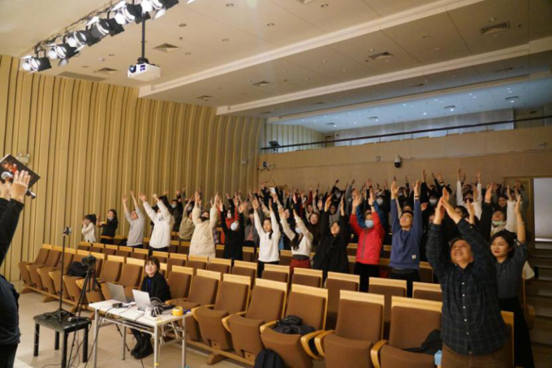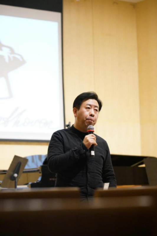 本场演出邀请到了音乐学系刘小龙副教授作为特邀主讲人。正式开始前,刘小龙老师用有趣的方式带领全场观众做起了“伸展运动”,让在座的同学们“打起了精神”,以更加放松舒适的状态聆听接下来精彩的演奏与讲解。