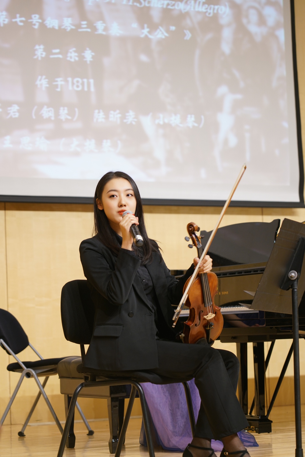 本场演出的第一首作品,是贝多芬于1811—1813年间所作的《降B大调第七钢琴三重奏》(Op.97“大公”),由管弦系研二学生陆昕奕、研一学生王思瑜、王子君三位同学进行演奏。这是严格意义上贝多芬的最后一部中期作品,而演出选取的第二乐章谐谑曲部分活灵活现,极具诙谐幽默感。贝多芬在写作第二交响曲时也开始有意地在四个乐章中大量套用谐谑曲曲式。