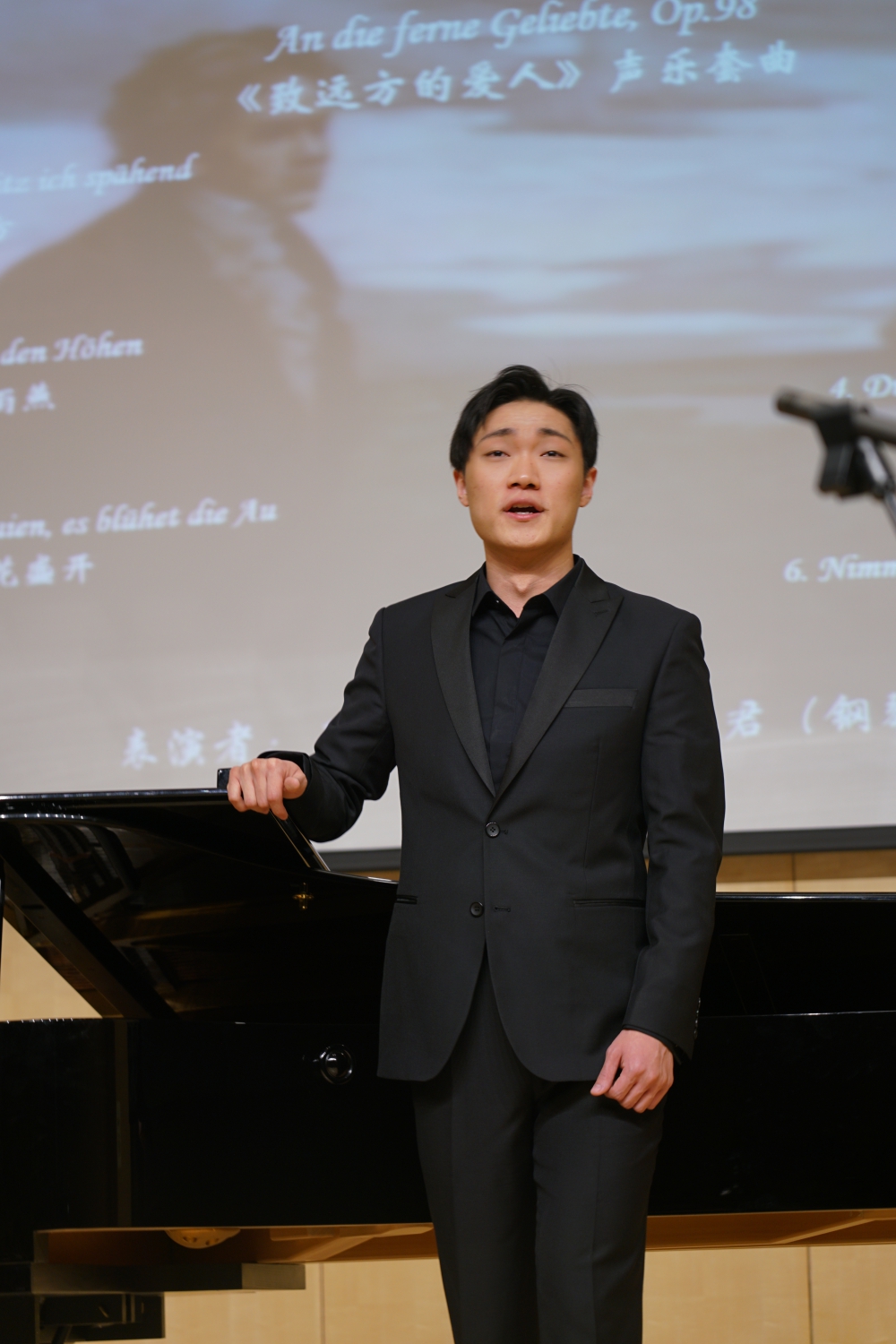 本场演出的第三首作品,是贝多芬于1816年根据阿洛伊斯·耶泰莱斯的六首爱情抒情诗谱写而成的声乐套曲《致远方的爱人》,由声歌系研二学生男中音王楠演唱、钢琴系研一学生王子君进行钢琴艺术指导。刘小龙老师提到:“艺术歌曲的创作,是以诗歌作为音乐创作的核心,用一整套贯通的音乐相配合,使诗歌内容产生一定的相应倾向性与流动性,塑造一个完整情感投放目标的过程。贝多芬在早年跟随海顿学习的过程中,累积了大量改编各国民歌歌曲的经验,并对这六首诗歌深有感触,于是才能呈现出如此一部声乐套曲。而柏辽兹与门德尔松也对这套声乐套曲尤为看重。”