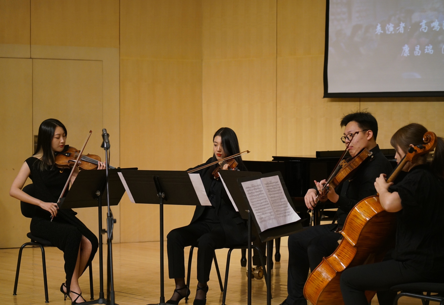 本场演出的第四首作品,是贝多芬于1806-1807年间创作的《F大调第七弦乐四重奏》(Op.59 No.1“拉斯莫夫斯基”),由管弦系研一学生高鸣阳、康昌瑞、王思瑜,研二学生陆昕奕四位同学共同演奏第一乐章。十八世纪中期后,古典重奏体制逐渐形成,而贝多芬也于1798年后开始认真写作弦乐四重奏。刘小龙老师提到:“拉斯莫夫斯基四重奏是贝多芬创作中期献给驻维也纳俄国公使的扛鼎之作,此时也是他创作最富活力的时期。他在短短一年之内创作了作品59号的三部弦乐四重奏,同时积极地创作第五交响曲与《莱奥诺拉》的部分。”