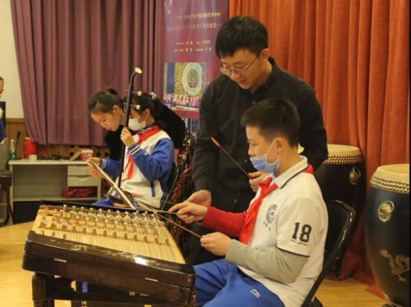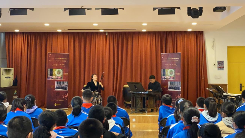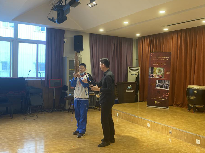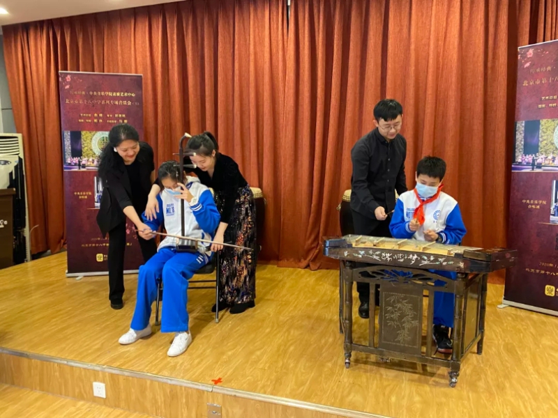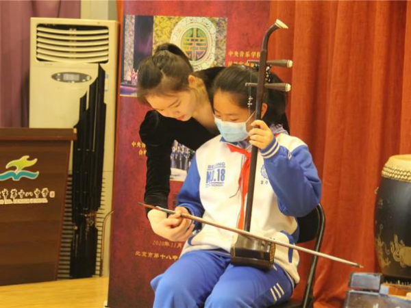 二胡演奏员周艺妮、扬琴演奏员朱江阳与学生互动,一对一教授二胡与扬琴的基本演奏技巧。