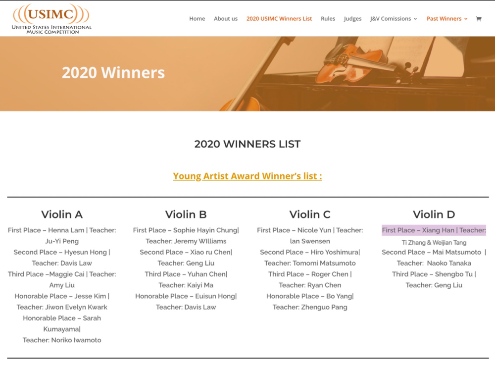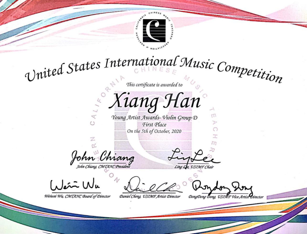 2020年8月获英国 新菁英国际音乐比赛弦乐组第一名:技巧名家奖,为弦乐组全组最高奖。并接受英国皇家音乐学院副董事的采访,在国内外各大媒体中发布。同月,获美国国际音乐公开赛,独奏组与青年精英组双料冠军。