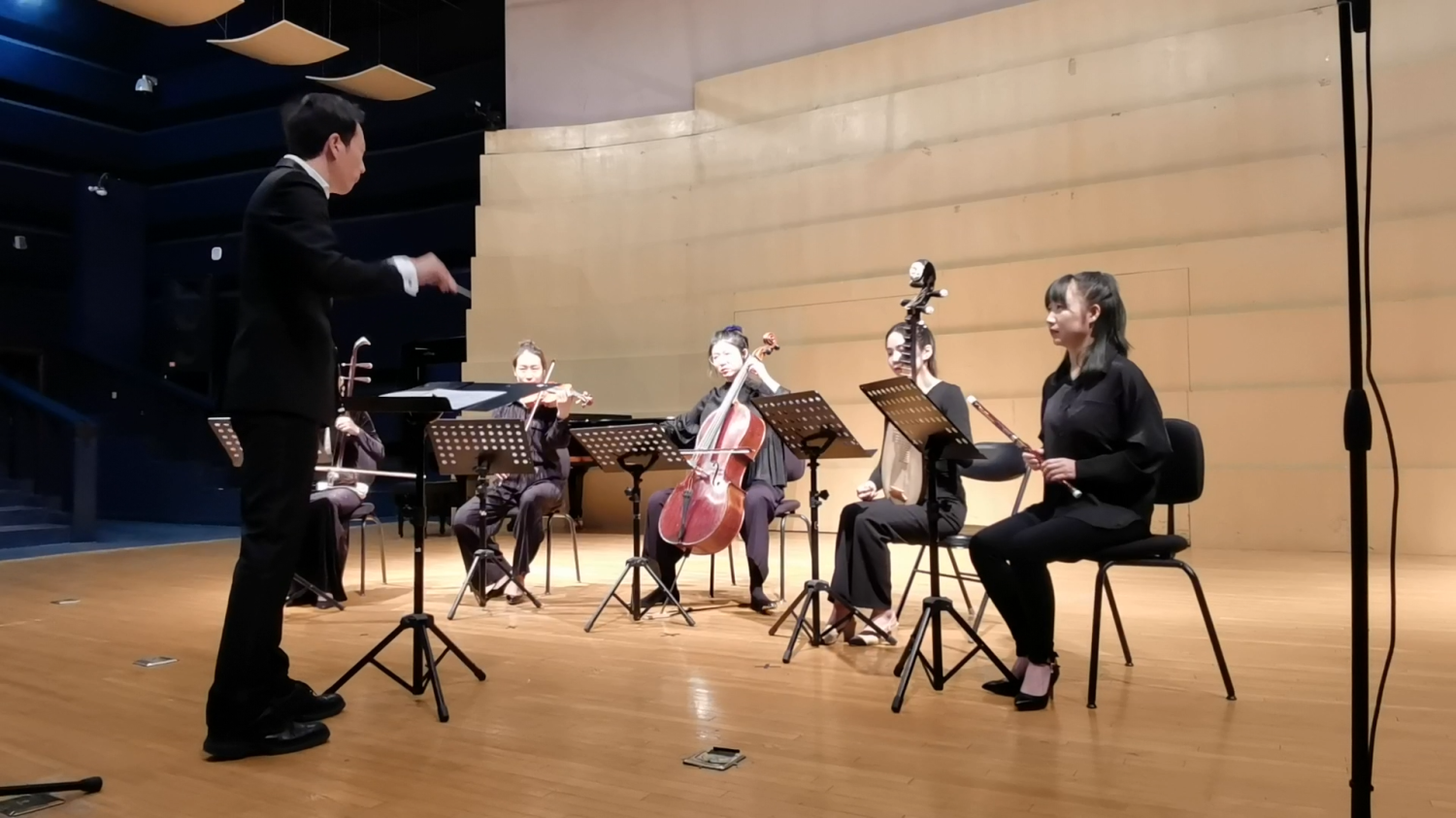 音乐会进行到后半程,精彩继续。原创精神十足的《第二弦乐四重奏》(作曲:张光一)以非主题动机旋律化的音型化织体,表达出运动物质的世界。不断的滑奏象征着变化的物质,而长时间持续的单音象征着稳定固态的物质——其内在的细微涌动以音色的变化来象征。