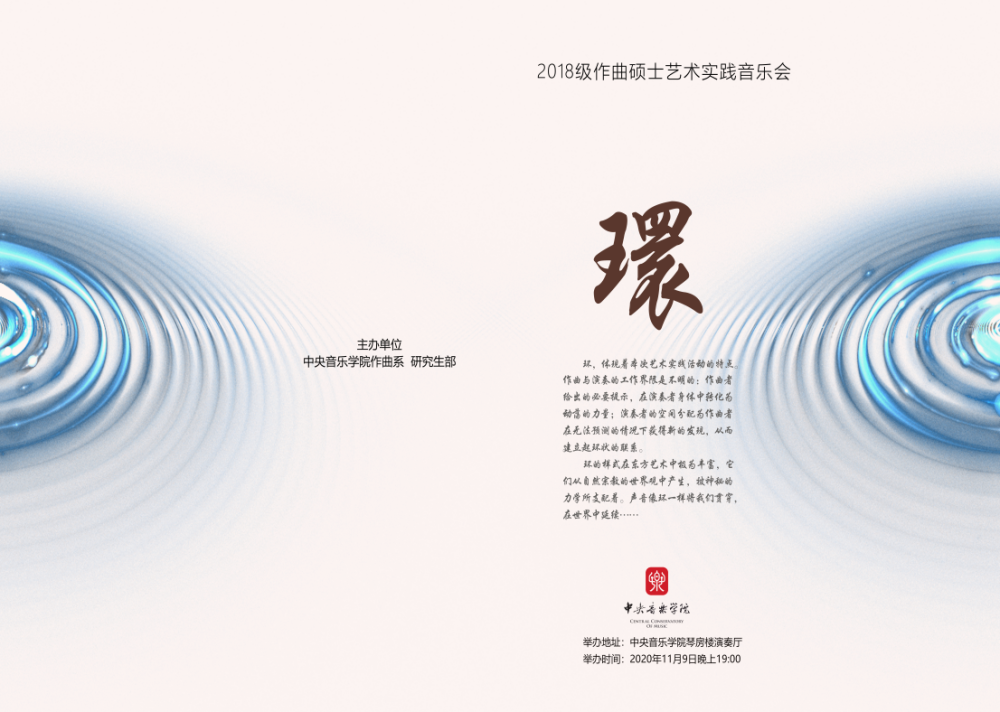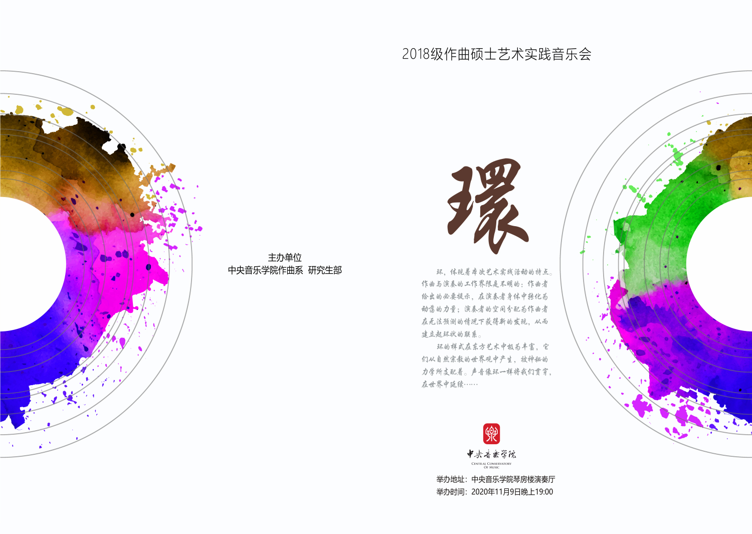 2020年11月9日晚七点,由开云kaiyun官方网站作曲系及研究生部联合主办的,2018级作曲系硕士研究生艺术实践音乐会『環』在开云kaiyun官方网站琴房楼演奏厅精彩上演。艺术实践是开云官网研究生教学工作中极为重要的环节,是课堂的延伸。本场音乐会的主旨是为了将课堂教学和艺术实践相结合,促进不同专业之间的互动,并提高学生的整体素质和专业水平,实现培养高层次、应用型音乐人才。在疫情防控常态化的当下,作曲系2018级研究生班的十一位硕士生作曲家们携手同心,共克时艰。以饱满的热情进行创作、排练,精心地准备了这场演出。
