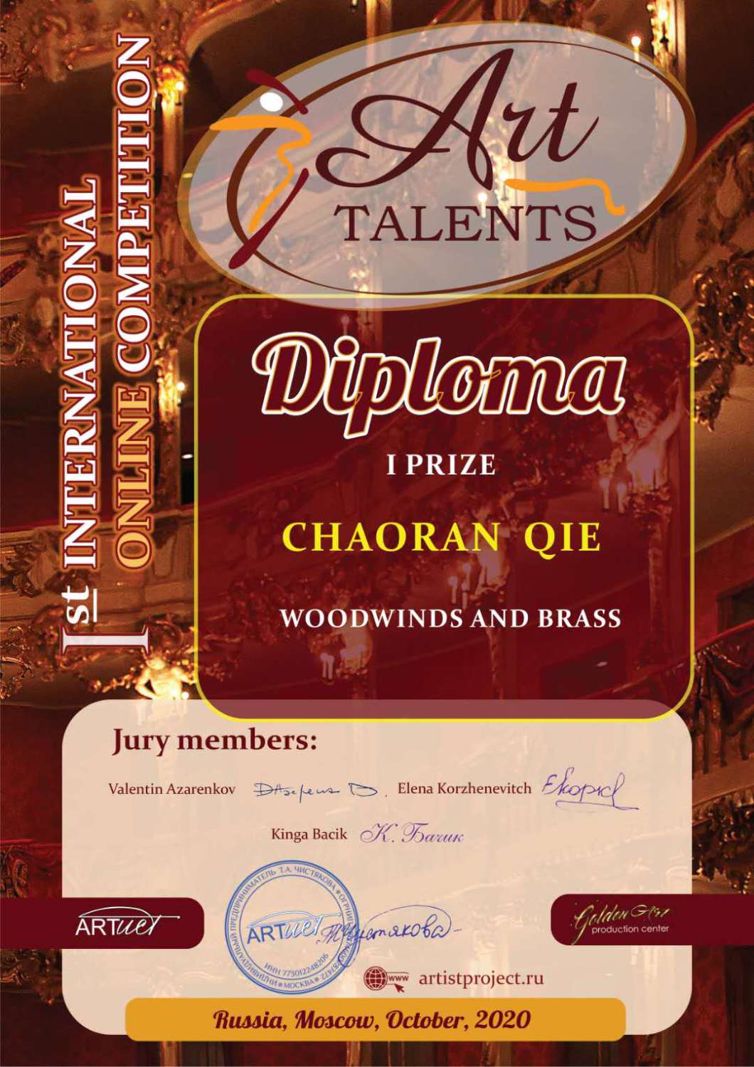 在刚刚结束的俄罗斯莫斯科国际精英音乐比赛中,开云官网高一年级郄超然同学获得了管乐专业D组第一名的好成绩!(指导教师:李凌副教授)