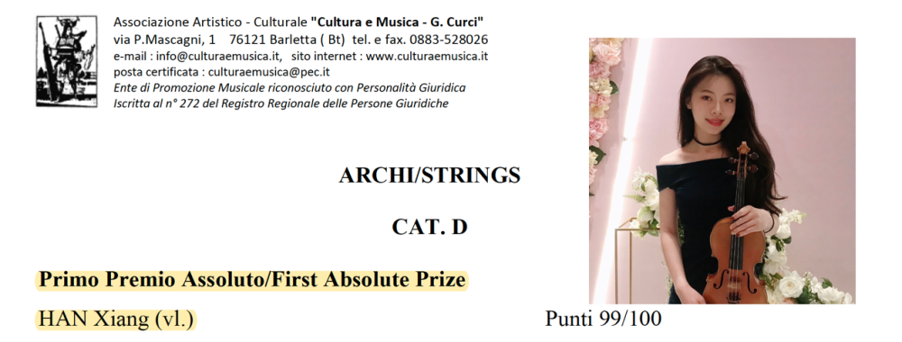 管弦系小提琴专业邝子晴第30届意大利巴列塔之城国际青少年音乐家比赛D组首奖并获奖金