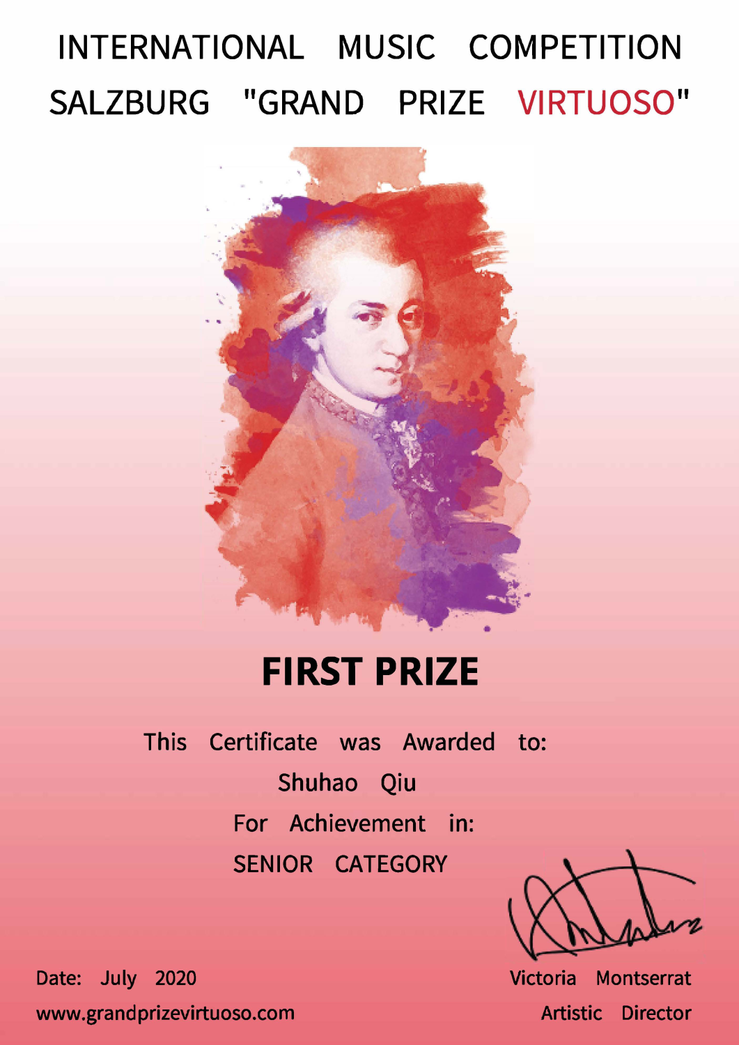 2020年9月荣获第30届意大利巴列塔之城国际青少年音乐家比赛一等奖、音乐家特别奖;
