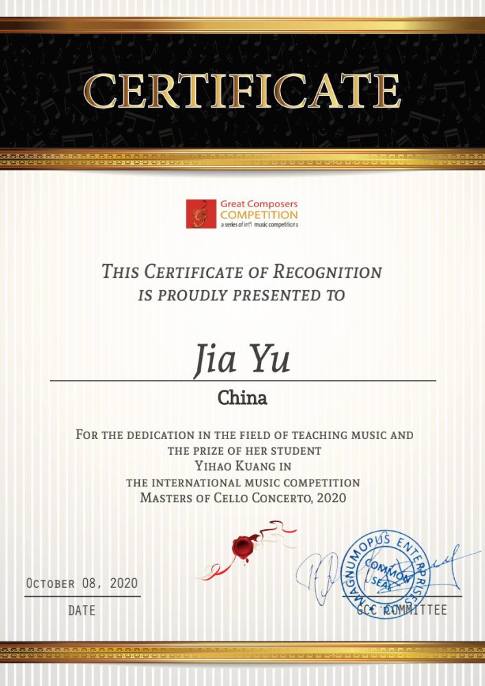 2020年获得普罗科菲耶夫国际音乐大赛大提琴少年专业组唯一的金奖。