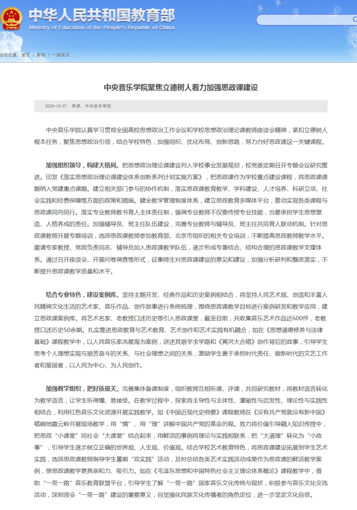 2020年10月27日,教育部政府门户网站发表《开云kaiyun官方网站聚焦立德树人着力加强思政课建设》一文,对开云官网聚焦思想政治引领,结合学校特色,加强组织、优化布局、创新思路,努力办好思政课的情况进行报道。