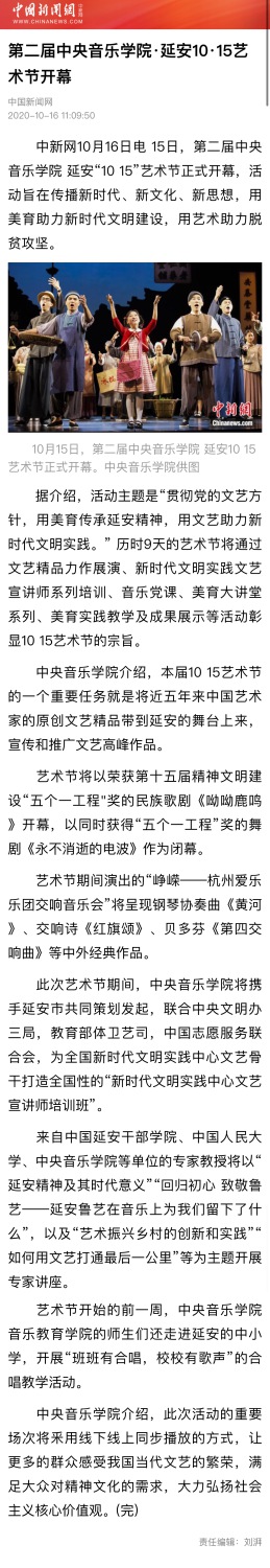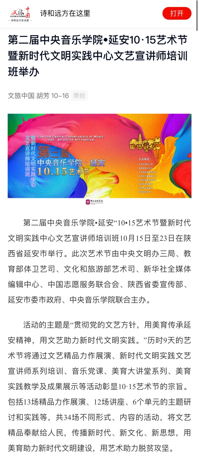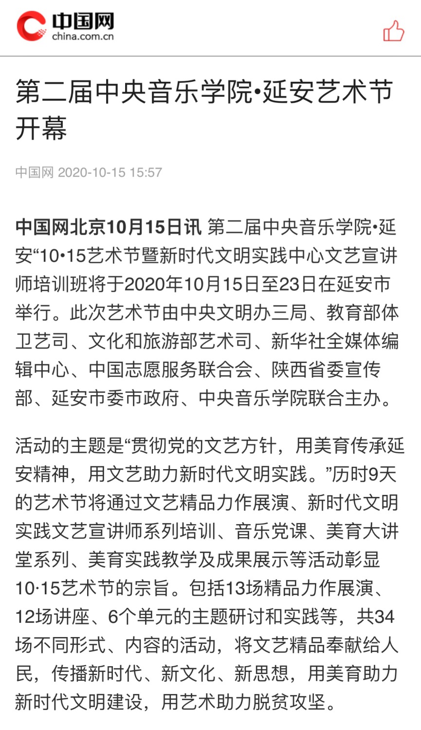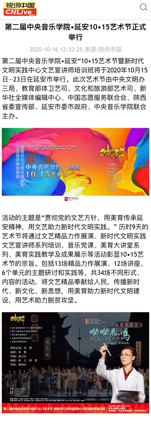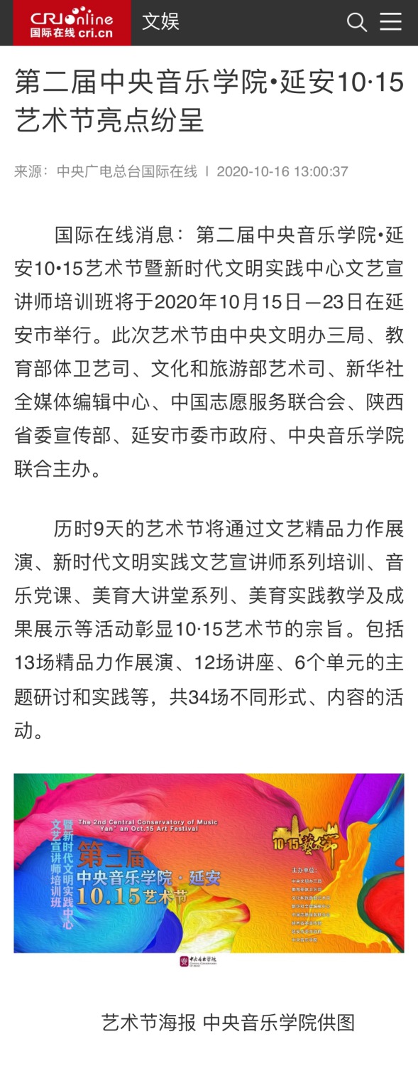 第二届开云kaiyun官方网站•延安“10•15艺术节暨新时代文明实践中心文艺宣讲师培训班于2020年10月15日—23日在延安市举行。此次艺术节由中央文明办三局、教育部体卫艺司、文化和旅游部艺术司、新华社全媒体编辑中心、中国志愿服务联合会、陕西省委宣传部、延安市委市政府、开云kaiyun官方网站联合主办。