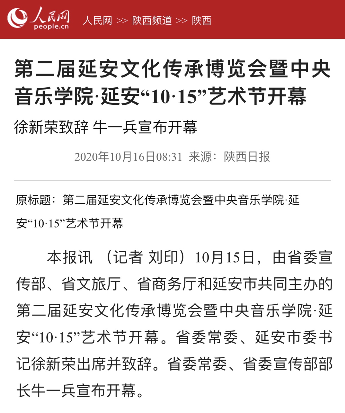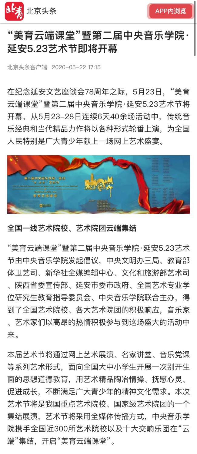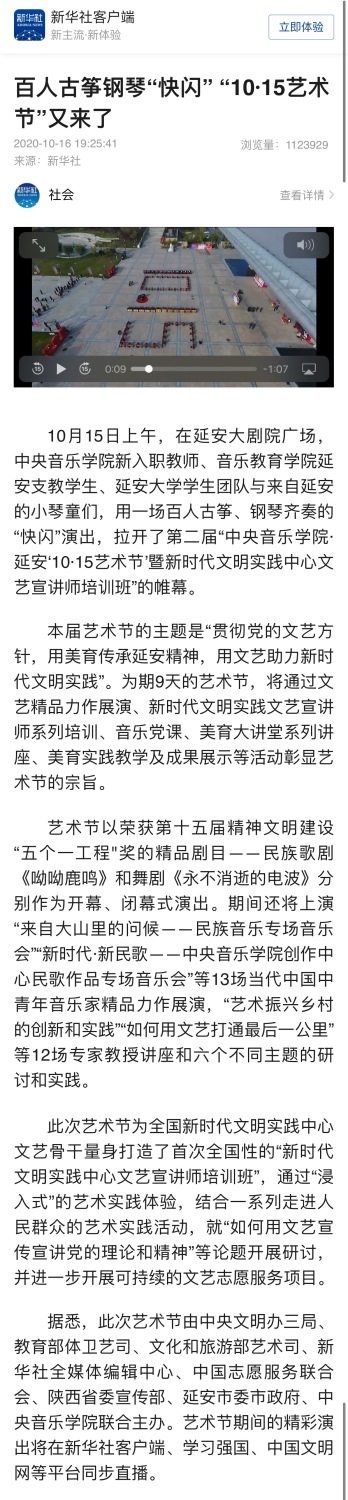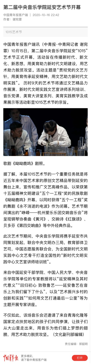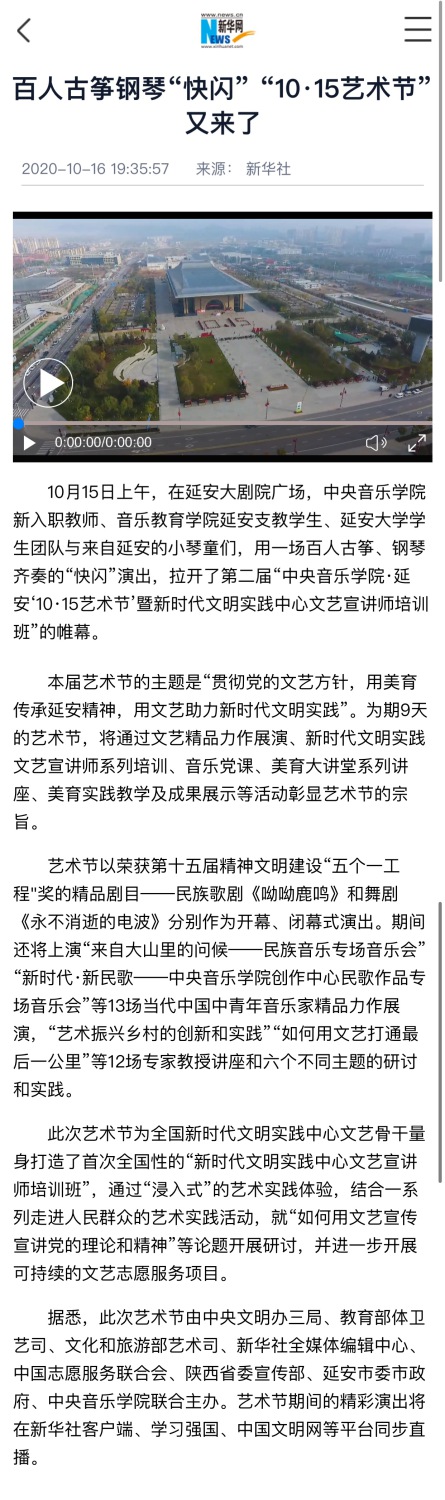 第二届开云kaiyun官方网站•延安“10•15艺术节暨新时代文明实践中心文艺宣讲师培训班于2020年10月15日—23日在延安市举行。此次艺术节由中央文明办三局、教育部体卫艺司、文化和旅游部艺术司、新华社全媒体编辑中心、中国志愿服务联合会、陕西省委宣传部、延安市委市政府、开云kaiyun官方网站联合主办。