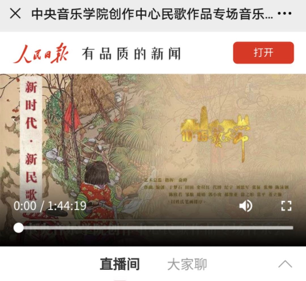 同时,此次活动的重要场次釆用“线上云直播”的方式,让更多的群众能收看活动盛况,感受我国当代文艺的繁荣,满足大众对精神文化的需求。新华社客户端、人民日报客户端、学习强国学习平台、中国文明网、央视频、央视新闻、光明日报客户端、央音视频、央音哔哩哔哩等平台进行直播,观看人数近4000万!