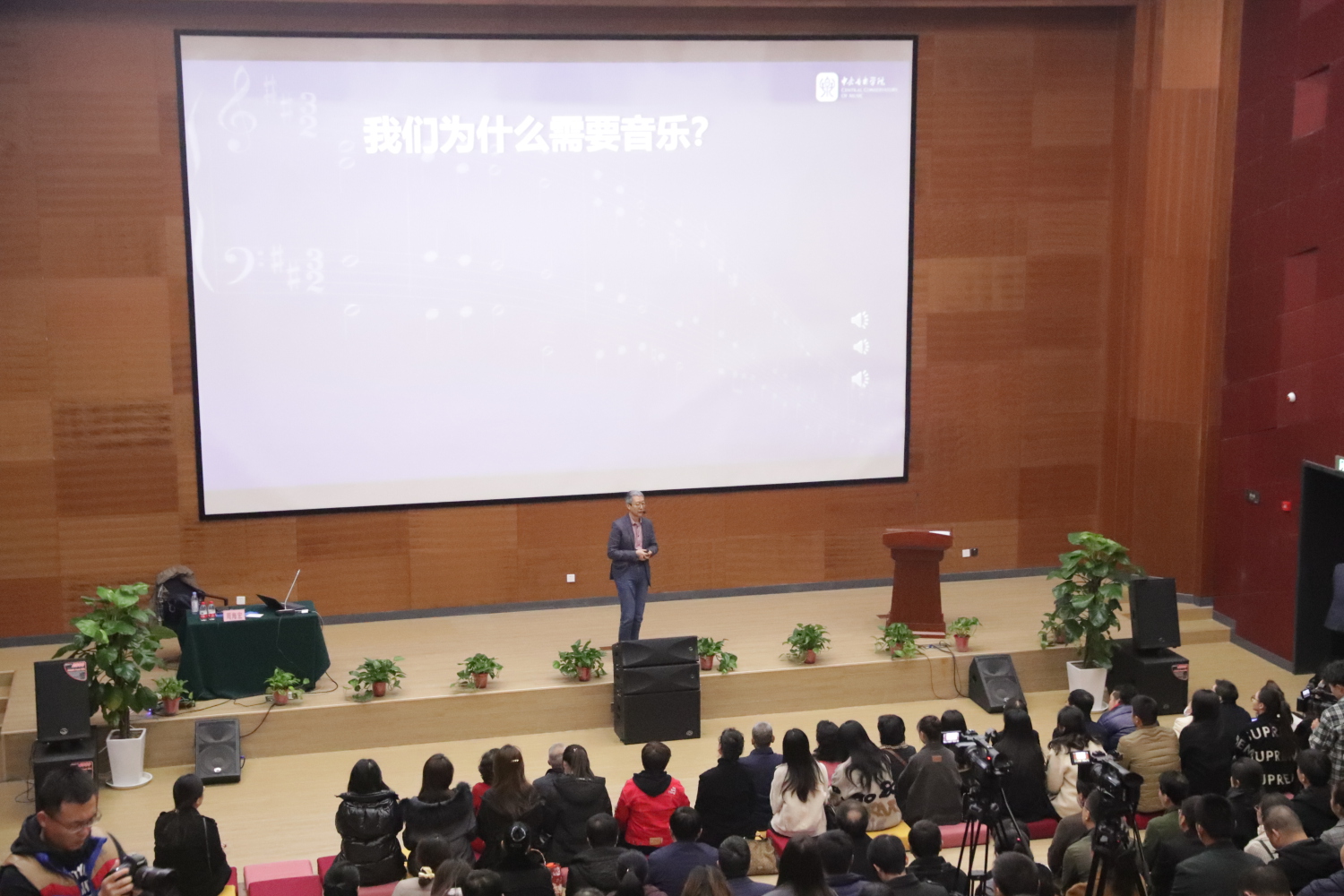 此次讲座周海宏老师分六个话题进行讲述:文艺与幸福感,我们要去学习获得幸福的方法,不仅要拥有获得幸福条件的素质,还要拥有体验幸福感受的素质,懂得享受及体验生活,才会发现生活中的美好;文艺与社会治理,我们需从小培养国民热爱艺术的生活态度,用高品质文化生活填充精神空间,享受艺术的生活习惯;文艺与国家强大,通过感性智慧把技术变成艺术、让产品成为作品使得全民感性素质整体提升;文艺与美丽中国,建设美丽中国,需要爱美的国民。富起来、强来后,我们更要要让中国美起来;文艺能做什么?文艺该做什么?艺术美化世界,艺术教育培养人美化世界的愿望。我们的核心奋斗目标是“把我国建设成为富强民主文明和谐美丽的社会主义现代化强国” ;文艺应该怎样为人民服务,挑选适宜的曲目满足各类人及情况,创作更加丰富且多样性的曲目,努力提升国民审美能力,引导正确价值观。