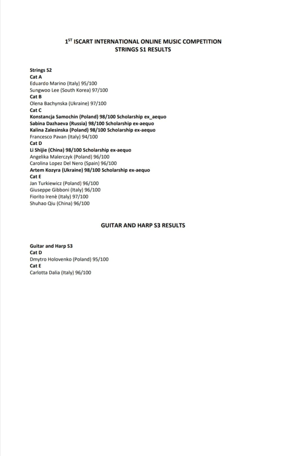 瑞士伊斯卡特国际音乐比赛始于2020年,本届为首届。比赛项目有钢琴、弦乐、吉他和竖琴、管乐、打击乐、室内乐、歌剧,主办方为卢加诺伊斯卡特国际文化和音乐学校。第一届比赛就收到了全世界102位申请者的热情参与,他们来自中国、保加利亚、西班牙、意大利、英国、韩国、波兰、俄罗斯、希腊、荷兰、克罗地亚、塞尔维亚、乌克兰、日本、南非、捷克、葡萄牙、斯洛维尼亚。
